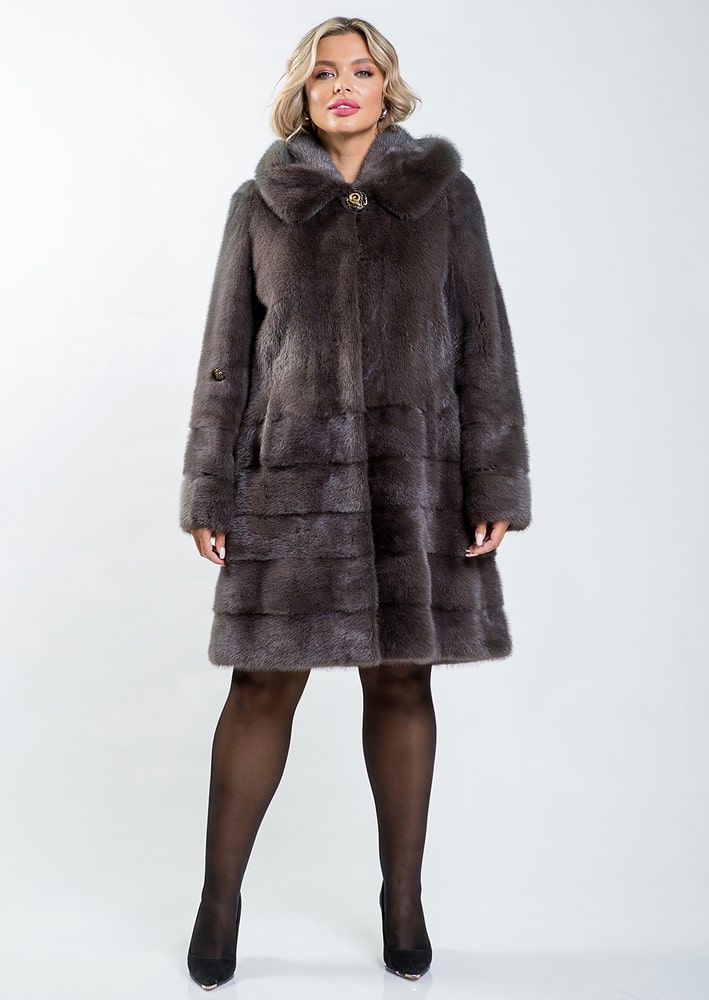 Норковое полупальто классического силуэта, длиной 120 см, отшито методом пластины с добавлением роспуска. Среди его сильных сторон:
