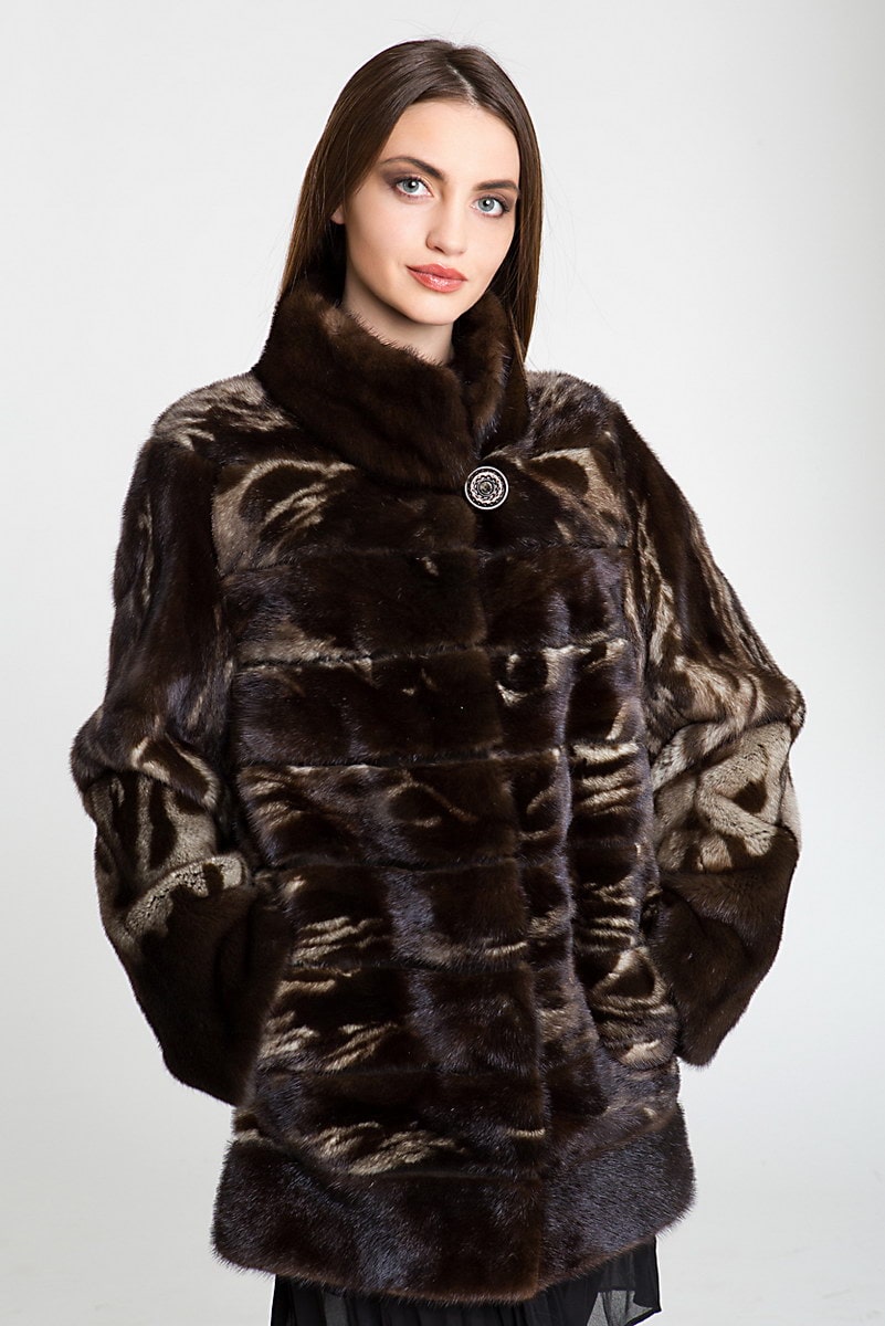 Эксклюзивность, максимальную привлекательность обеспечивает сложное комбинирование меха двух оттенков. Цвет миндаля, темный шоколадный оттенок идеально сочетаются, качественно отражают все достоинства норки. Прямой крой, высокая стойка обеспечивают комфорт, отличную защиту от мороза и ветра. Куртка соответствует ритму жизни современной активной леди, гармонично сочетается с брюками, модной обувью, аксессуарами.