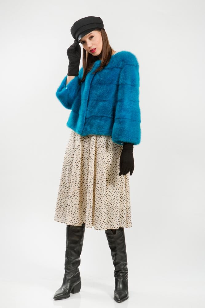Бирюзовая куртка-жакет из меха норки этой модели соответствует трендам сезона 2023-2024. Ее элегантный прямой фасон еще долго не выйдет из моды. Особый шик ей придает: