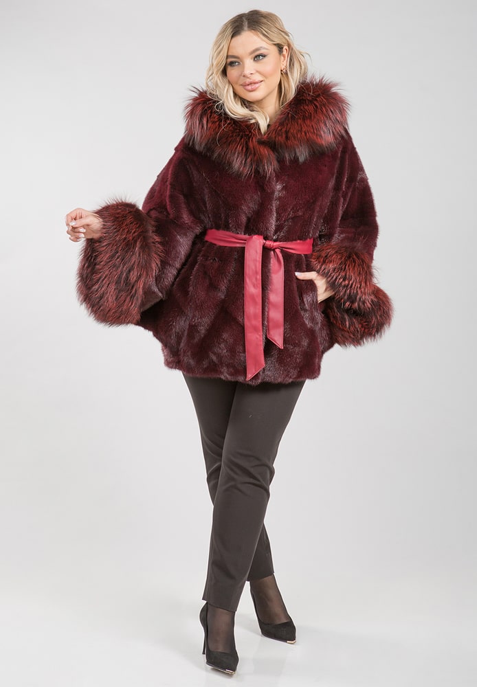 Бордовая куртка-пончо из меха норки, на которую весь май действует хорошая скидка, имеет прямой силуэт под пояс, который идет в комплекте, и отшита по технологии пластины с добавлением роспуска. Капюшон и рукава декорированы роскошным мехом лисы, окрашенным в тот же оттенок, что и куртка.
