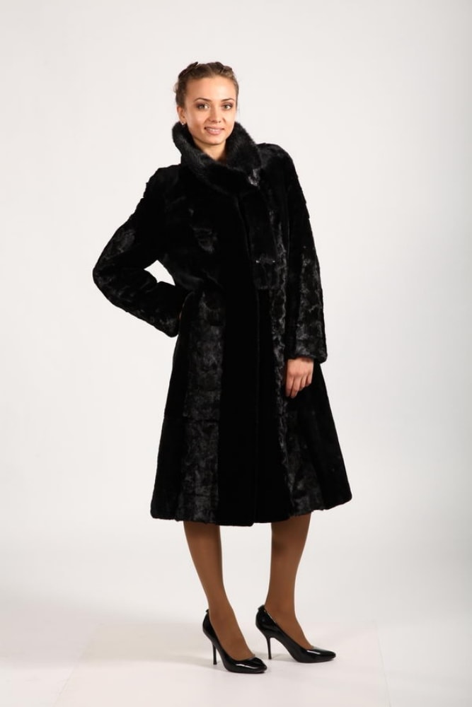 Эффектный, изысканный вид модели придает декор и воротник из меха норки, выгодно дополняющей нежный, шелковистый мутон. Воспользуйтесь возможностью создать утонченный образ без больших затрат!