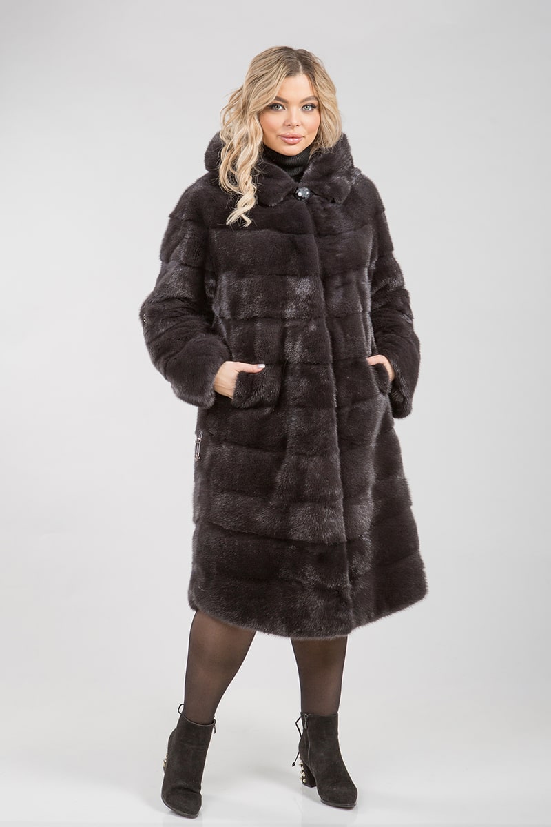 Участвующее в акции полупальто из меха норки подойдет зрелым женщинам 30+. Его выбирают приверженки классического стиля в одежде. Оно имеет весьма удачный крой – диагональная выкладка пластин, который добавляет объема там, где его не хватает, чем скрывает имеющиеся несовершенства фигуры. Среди сильных сторон этой модели: