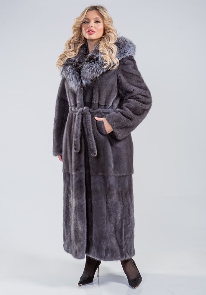Норковое пальто длины макси этой модели выполнено в универсальном цвете муссон, поэтому подходит под любой цветотип. Его можно дополнить яркими аксессуарами, оригинальным головным убором и модельной обувью. Для пошива использовалась технология пластины с добавлением роспуска, раскрывающая природную красоту натурального меха. Пальто имеет прямой силуэт. В комплекте к нему идет меховой пояс. Производителем предусмотрены регулирующие утяжки для коррекции по фигуре, и разрезы по бокам, благодаря которым макси длина не стесняет движения.