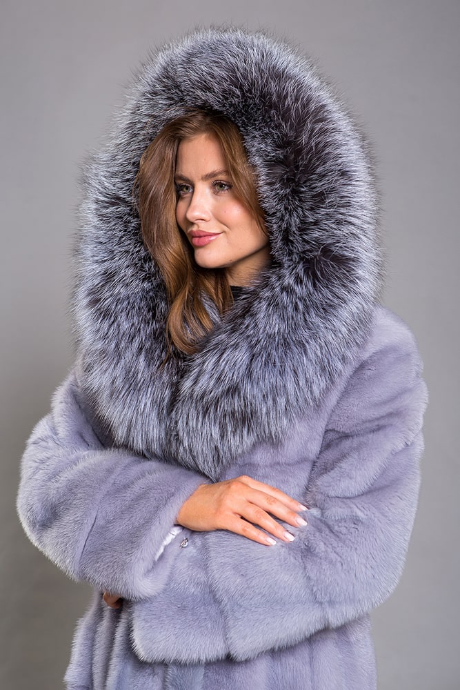 Эту модель полупальто из голубой норки можно носить с классическими брюками, что позволит создать элегантный офисный образ, с платьем для вечернего выхода или с джинсами для повседневного стиля. Наличие капюшона из чернобурой лисы делает его особенно выразительным, придает характерный и запоминающийся вид, защищает от холода и ветра.