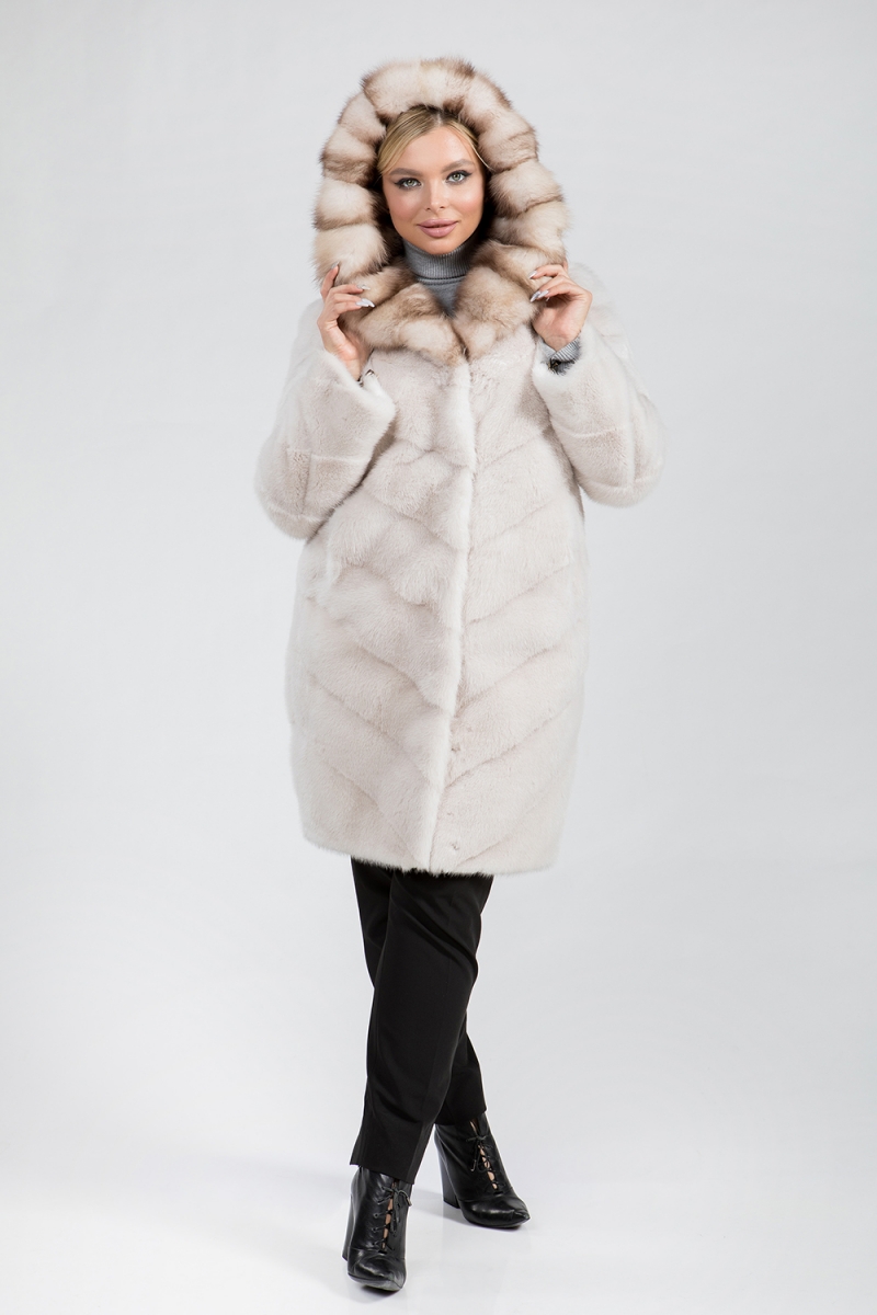 Норковое полупальто имеет утяжки внизу, на талии и на рукавах, позволяющие корректировать его по фигуре. Особый шик ему придает декорирование капюшона красивым и редким мехом куницы. Эта модель: