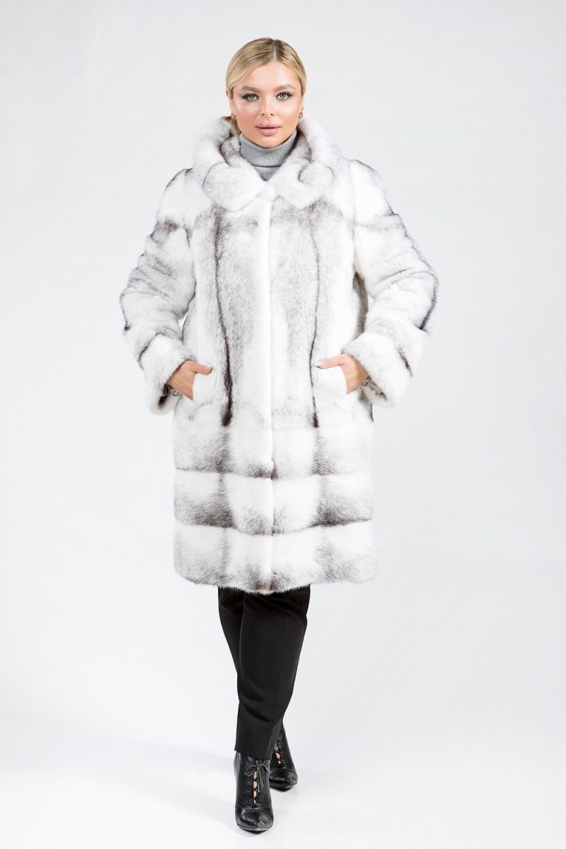 Вновь поступившие полупальто отшиты из меха норки оттенка Каменный (белый) по технологии роспуска и поперечной выкладки пластин в нижней части. Они оснащены: