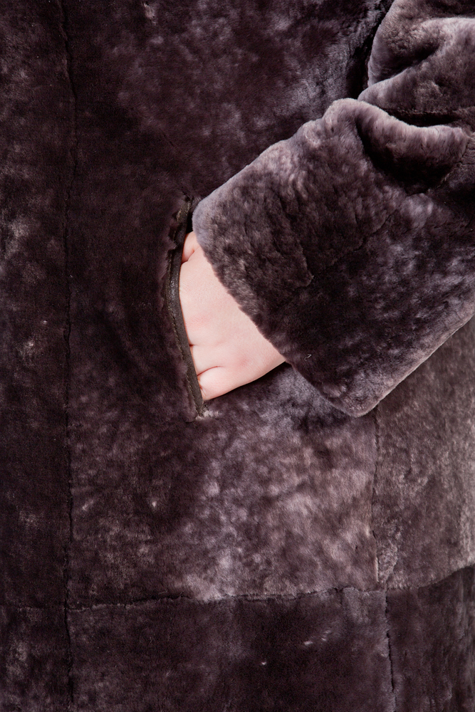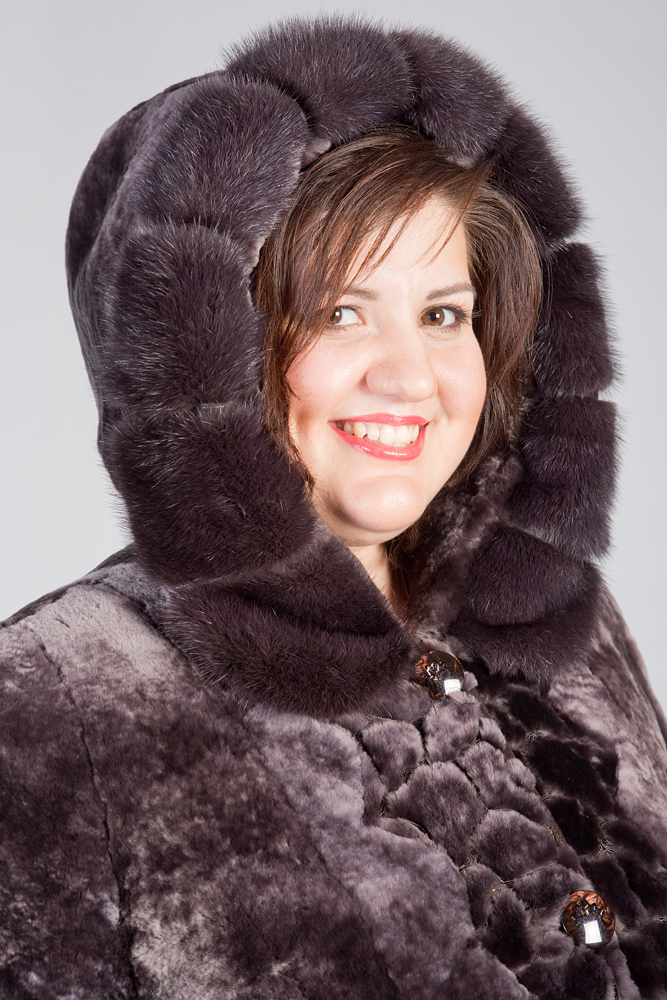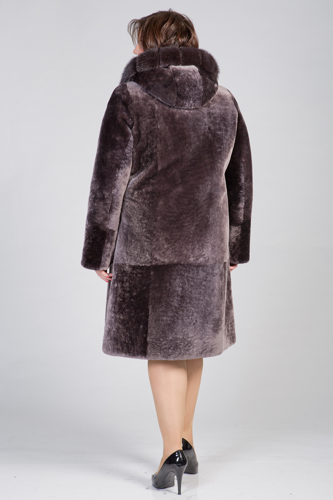 Полупальто из меха овчины. Модель классическая на пуговицах. Капюшон комбинирован мехом норки. Изделие декорировано узором из тесьмы и страз. Нет в наличии.