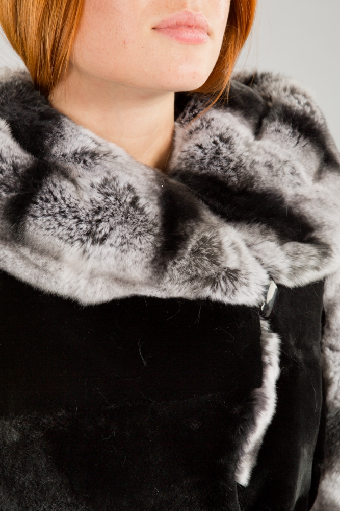 Полупальто женское из меха кролика Рекс с капюшоном. Крой изделия поперечная выкладка пластин. Рукава расклешенные 3/4. В комплекте трикотажные рукава. Нет в наличии.