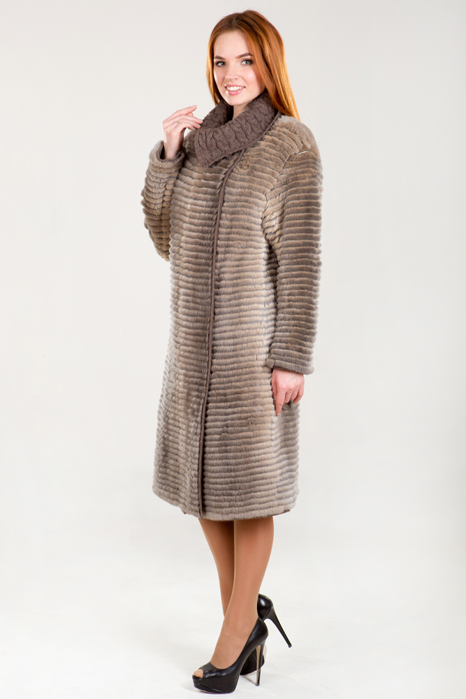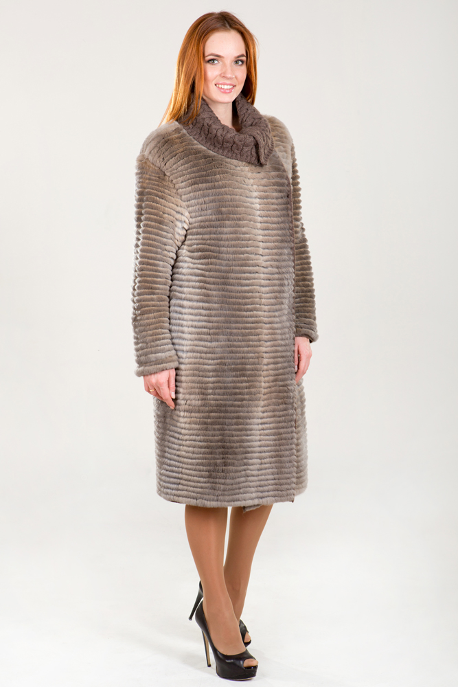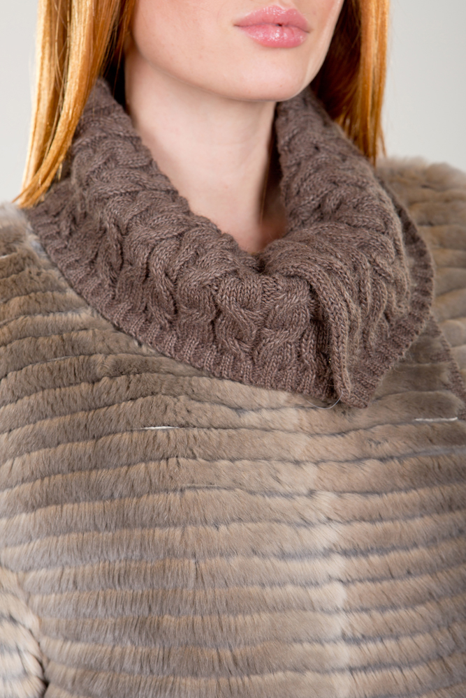 Полупальто женское из меха кролика "Рекс" на трикотажной основе. Модель приталенная, классическая. Изделие дополнено оригинальным вязаным трикотажным воротником. Нет в наличии.