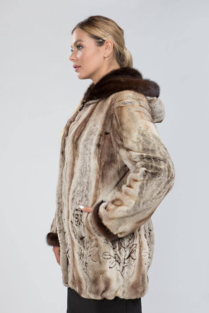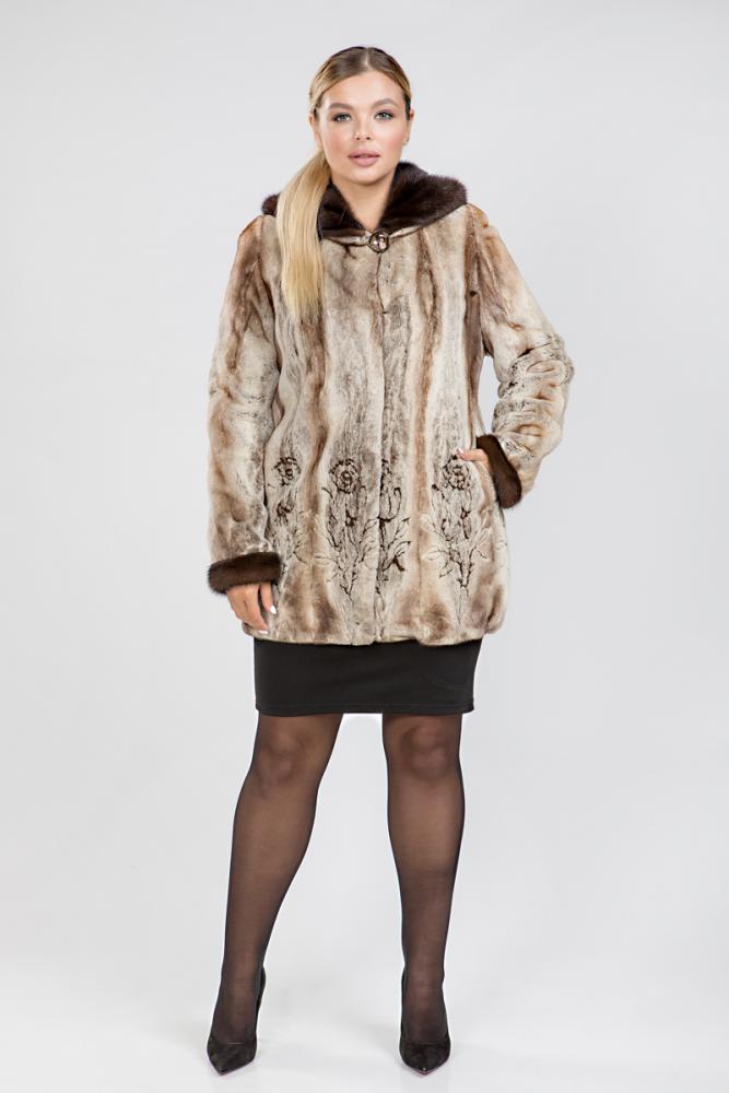 Куртка из меха стриженной норки с капюшоном. Крой изделия роспуск с добавлением пластин. По низу модель декорирована лазерной выстрижкой и украшена миниатюрными стеклярусами, которые при желании можно убрать. Длина курточки 80 см. С такой шубкой одинаково хорошо будут смотреться как юбки любой длины, так и брюки от свободных до облегающих!