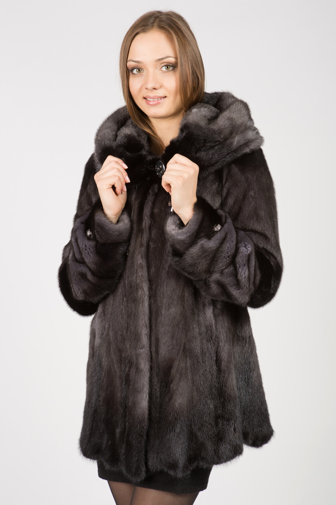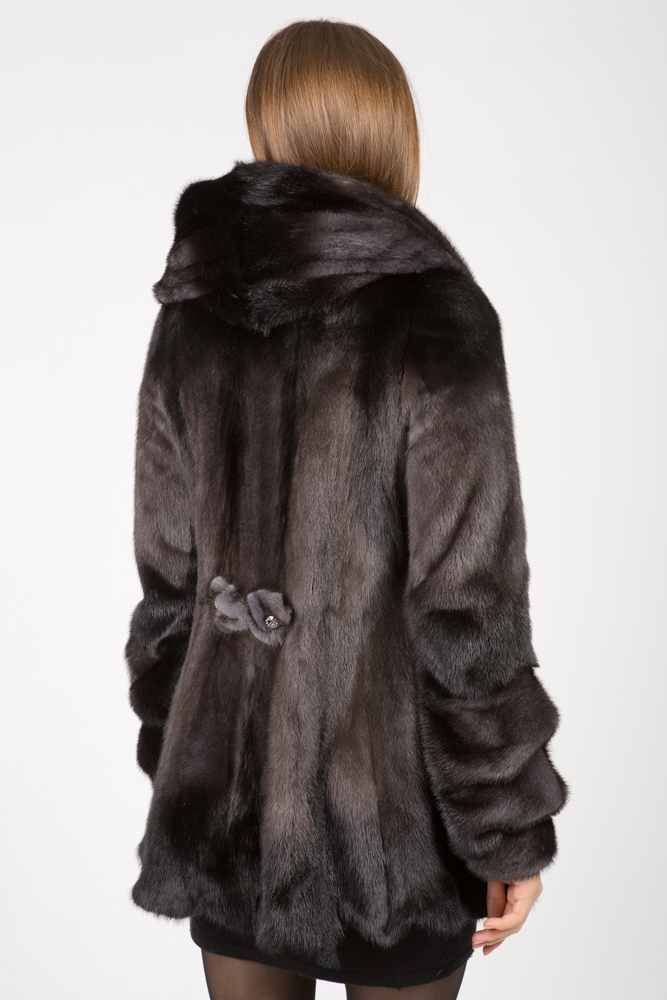 Женская куртка из меха норки с капюшоном. Модель расклешенная. Крой изделия роспуск. Рукава прямые на манжете. На спине декоративный бантик из меха норки. Нет в наличии.
