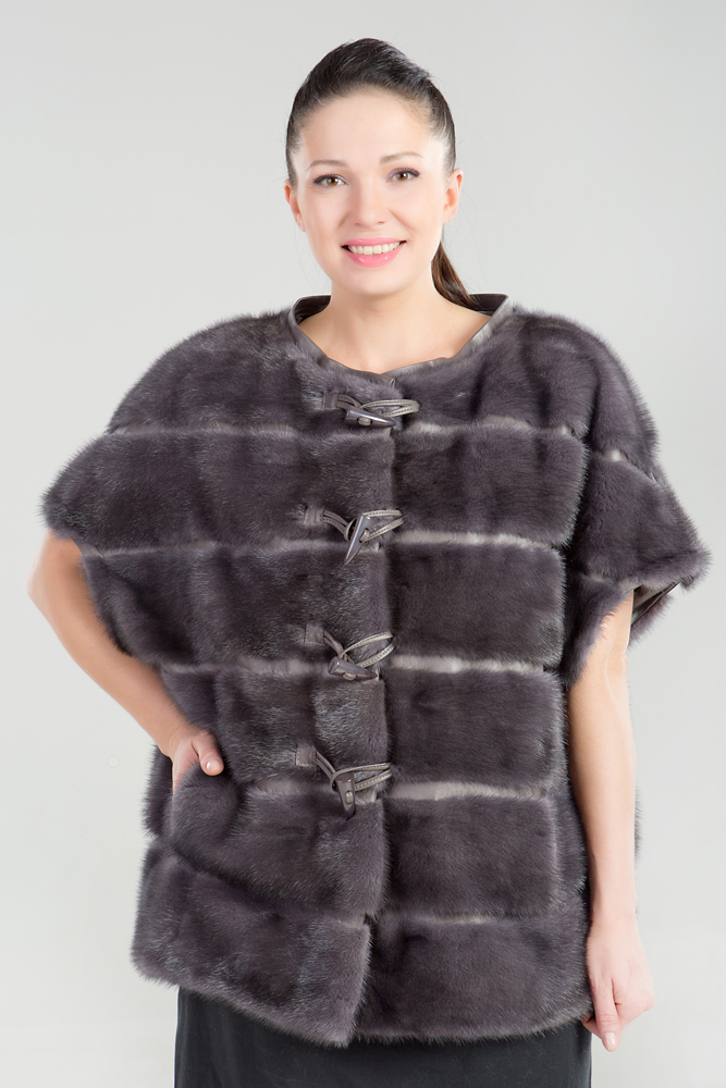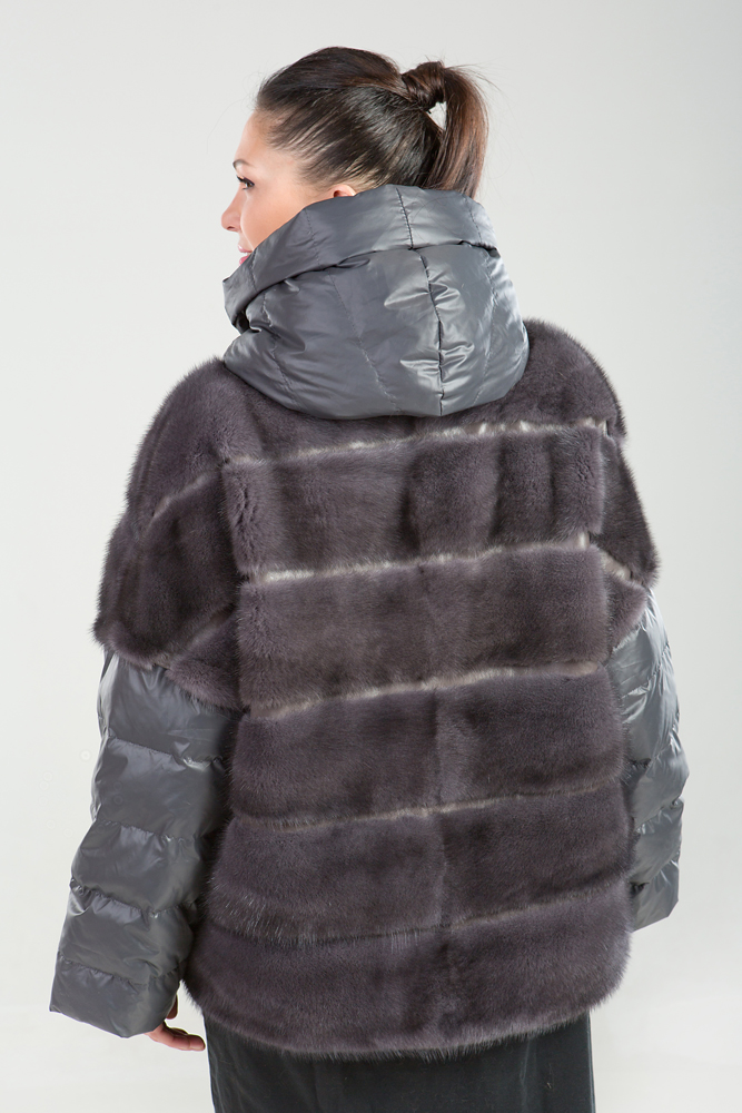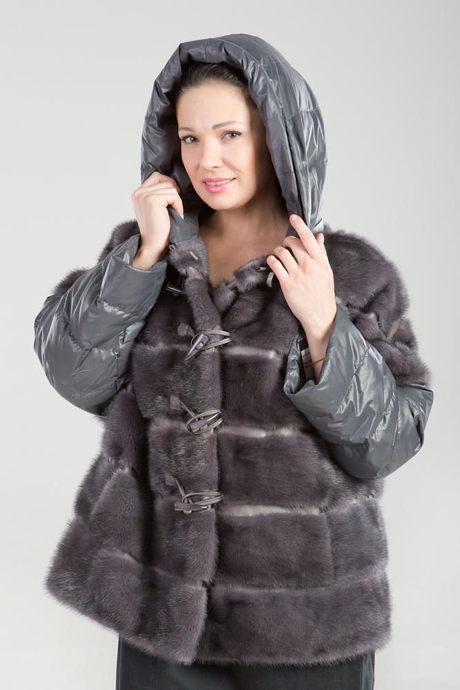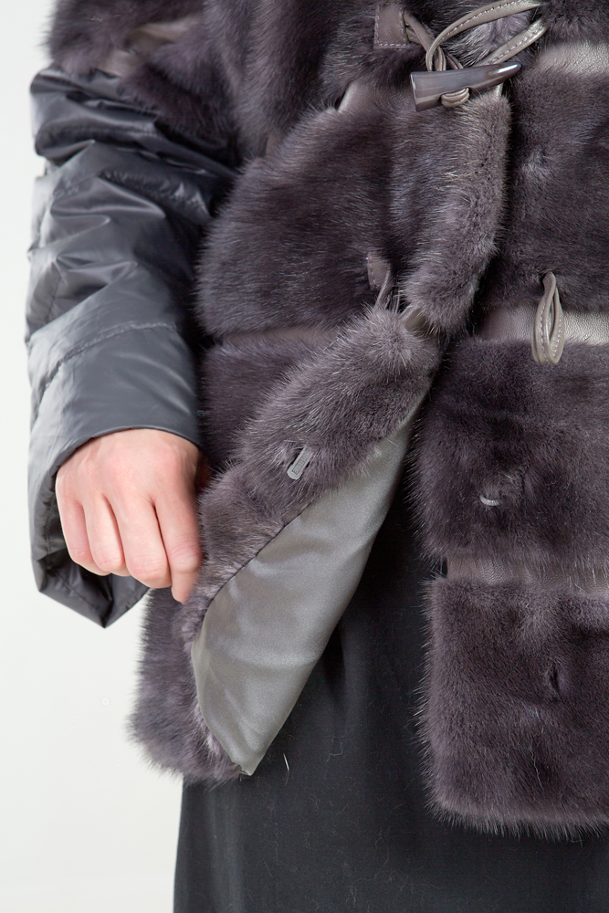 Норковая женская куртка трансформер. Модель классическая прямая с поперечной выкладкой пластин. Капюшон и рукава отстегиваются, изделие носится как жилетка. Модель комбинирована кожей. Нет в наличии.