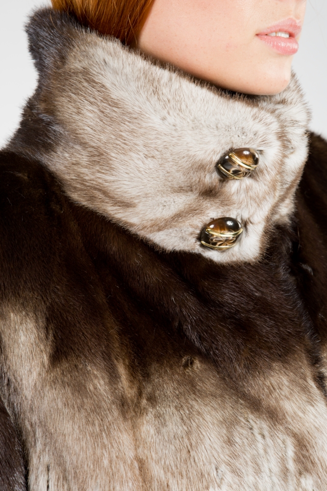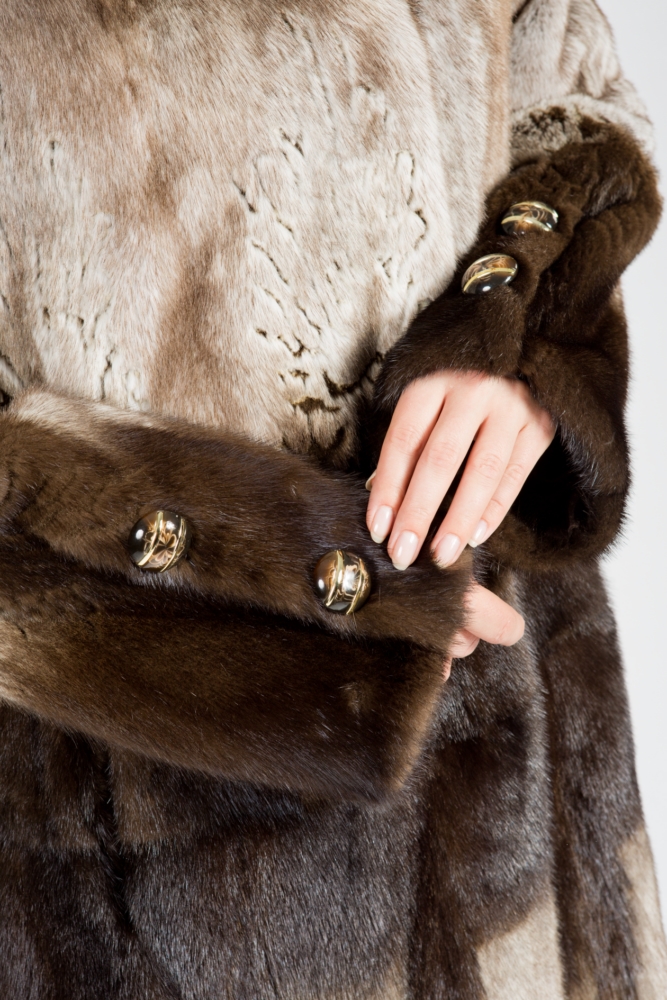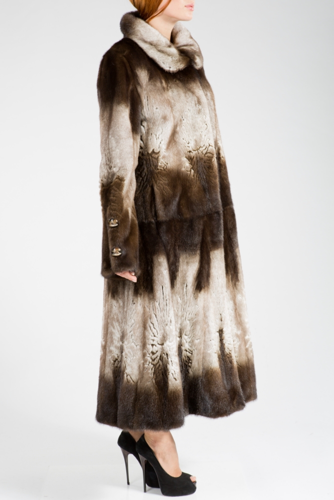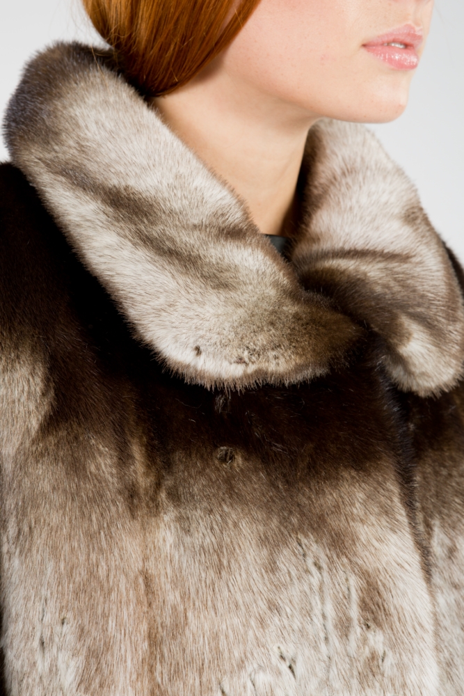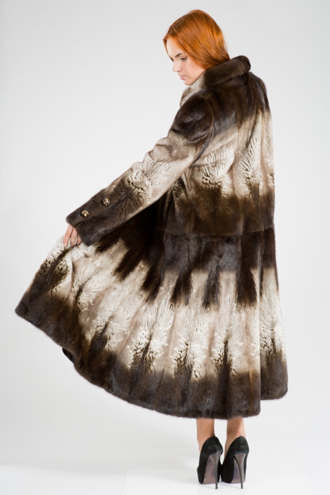 Пальто женское из меха норки с воротником. Крой пластины с добавлением роспуска. Рукава расклешенные. Изделие дополнено лазерной декоротивной выстрижкой. Нет в наличии.