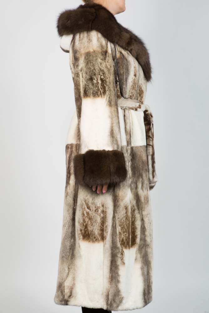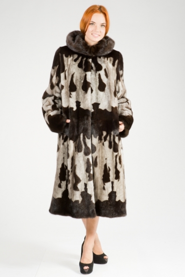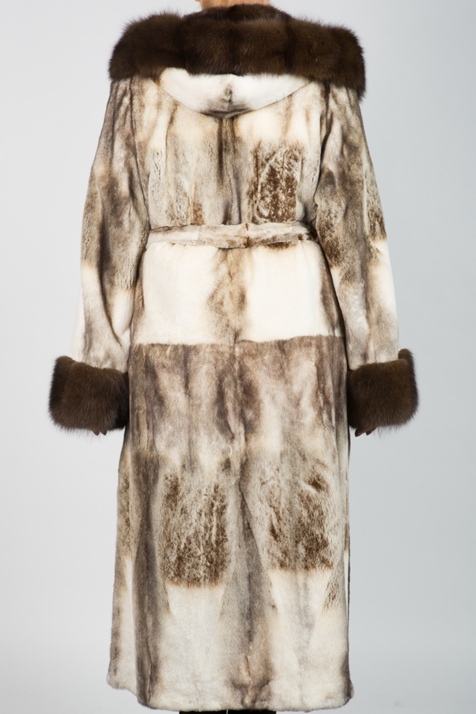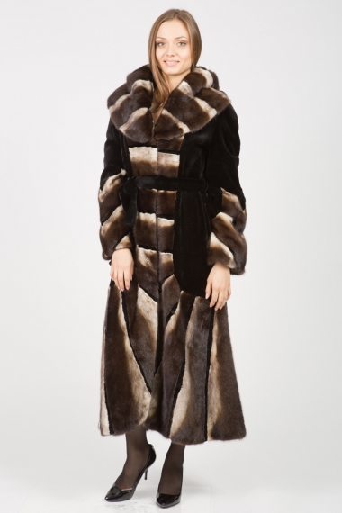 Женское пальто из меха стриженной норки. Модель классическая прямая с капюшоном. Крой пластины. Изделие дополнено мехом соболя. Пояс идет в комплекте. Нет в наличии.