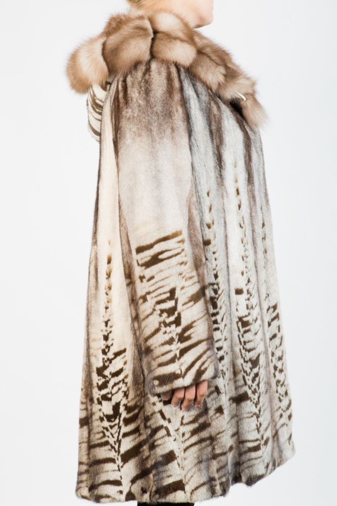 Полупальто женское из меха стриженной норки. Капюшон декорирован мехом куницы. Модель классическая расклешенная. На изделие нанесен трафаретный рисунок. Рукава прямые. Нет в наличии.