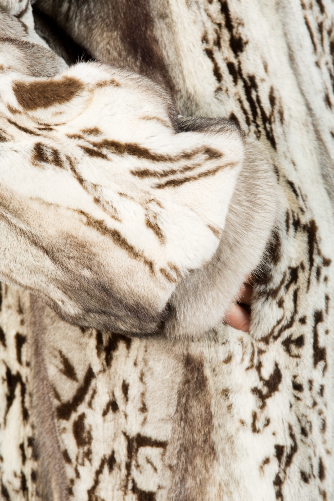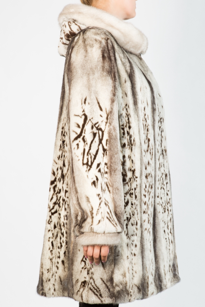 Полупальто женское из меха стриженной норки. Модель классическая расклешенная с капюшоном. Крой изделия роспуск. Рукава прямые. На изделие нанесен трафаретный рисунок. Нет в наличии.