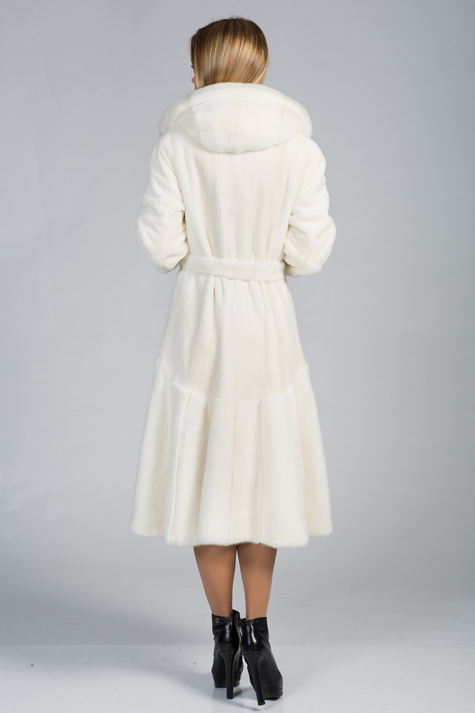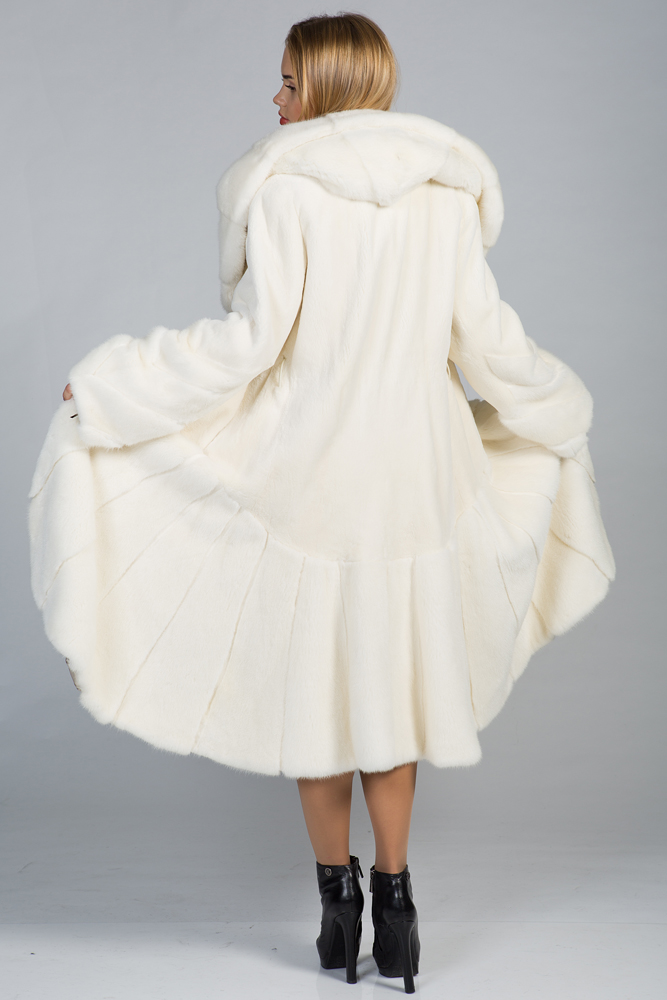 Женское полупальто из меха норки. Приталенный силуэт с объемным капюшоном. укава слегка расклешенные, пояс идет в комплекте. Крой изделия сшит в роспуск с добавлением диагональной и поперечной выкладкой пластин. Нет в наличии.