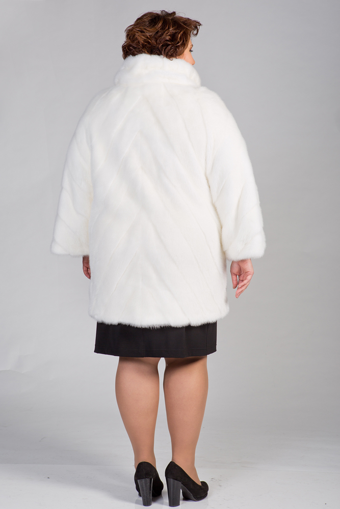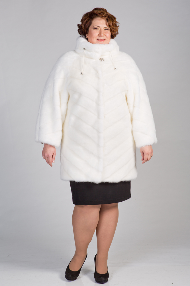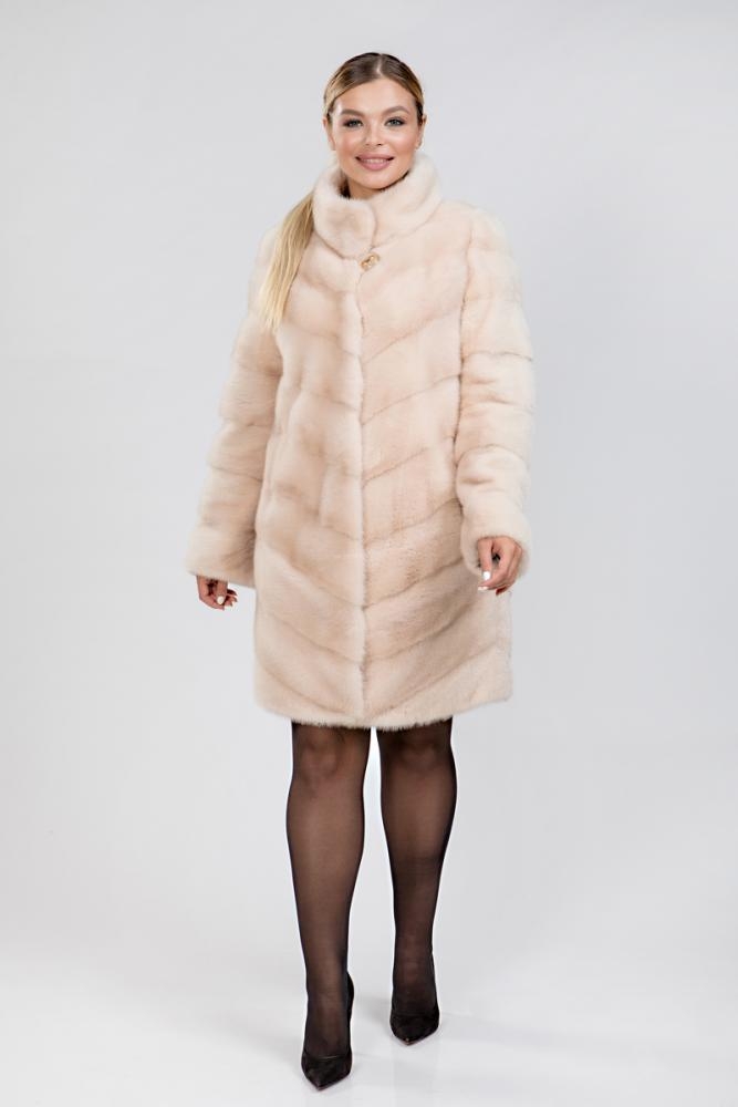 Женское полупальто из меха норки. Прямой классический силуэт. Пройма рукава занижена. Крой изделия диагональная выкладка пластин. На воротнике кулиска. По низу и на рукавах модели утяжка.
