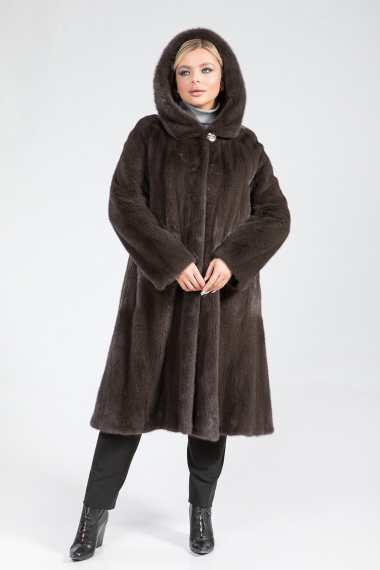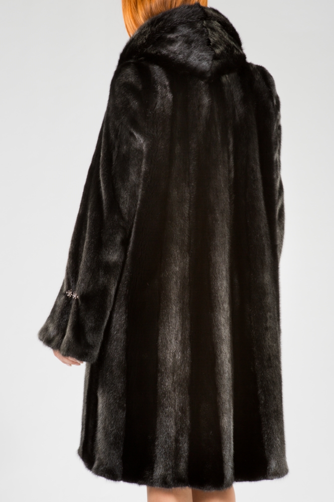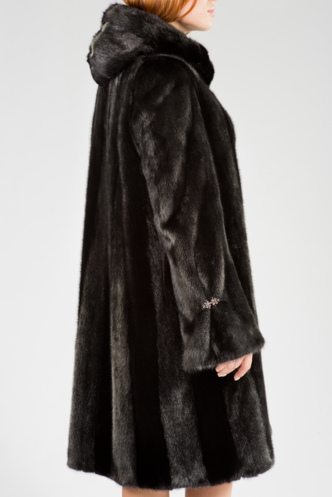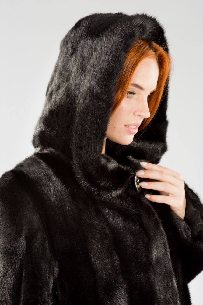 Полупальто из меха норки с капюшоном. Крой изделия роспуск, в разном направлении ворса. Внутри и на рукавах шубки имеются регулирующие утяжки. Длина изделия 90 см. Модель трапециевидная, слегка расклешена. Глубокий и насыщенный оттенок черного меха придает шубке оригинальность и выразительность!