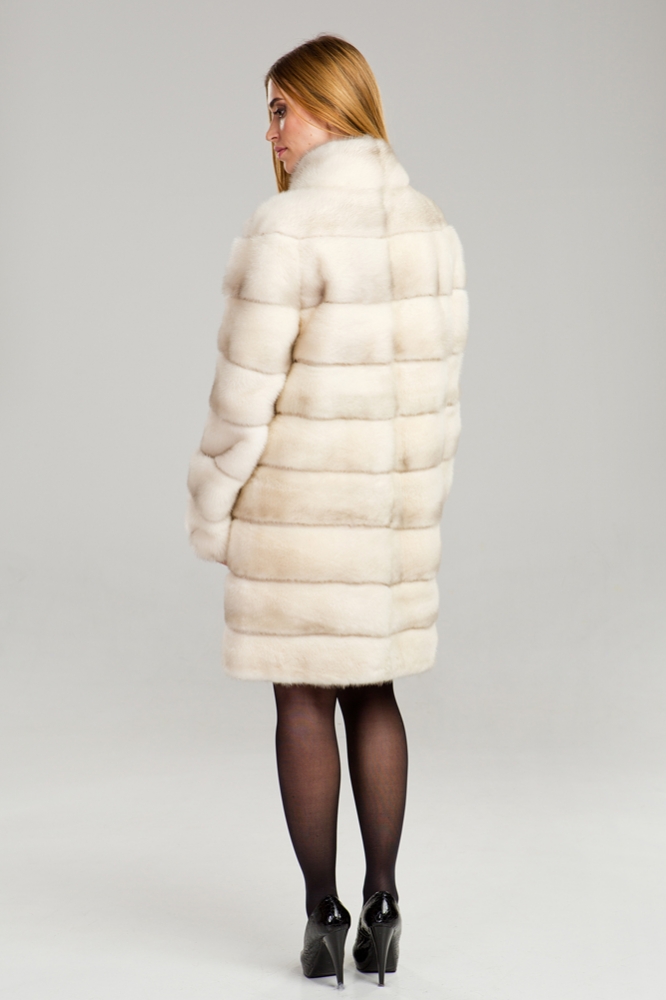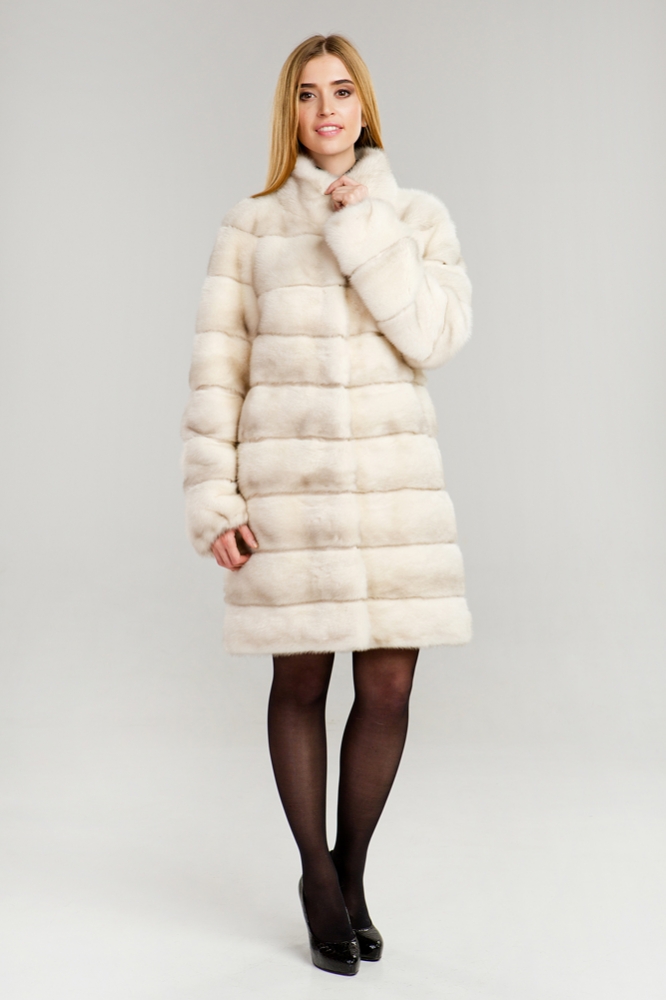 Полупальто женское из меха норки. Воротник стойка. Крой изделия - поперечная выкладка пластин с добавлением натуральной кожи. Раскошная и очень красивая шубка ждет Вас! Нет в наличии.