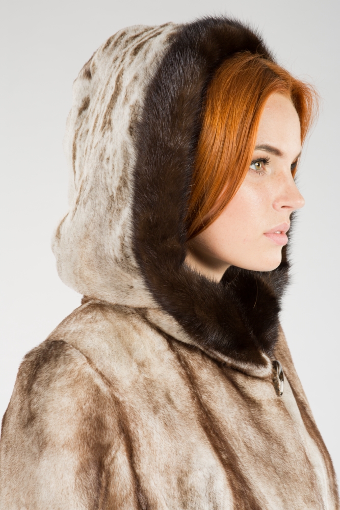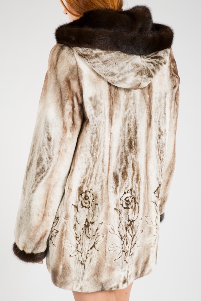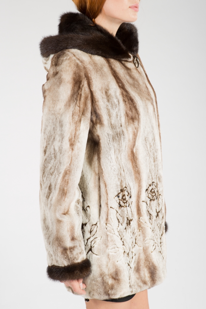 Куртка из меха стриженной норки с капюшоном. Крой изделия роспуск с добавлением пластин. По низу модель декорирована лазерной выстрижкой и украшена миниатюрными стеклярусами, которые при желании можно убрать. Длина курточки 80 см. С такой шубкой одинаково хорошо будут смотреться как юбки любой длины, так и брюки от свободных до облегающих!