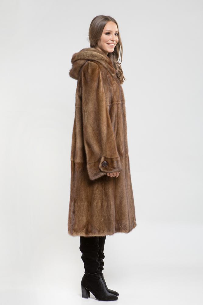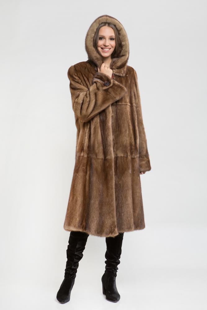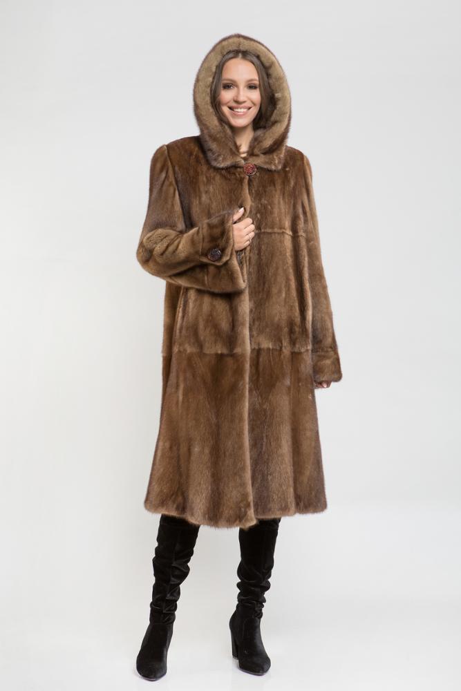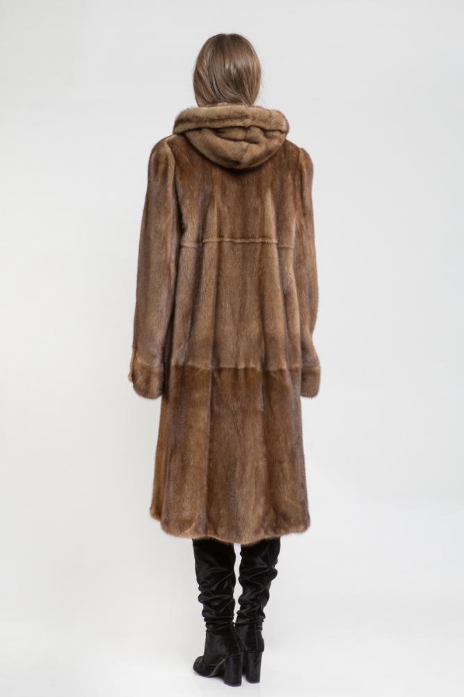 Полупальто из меха норки с капюшоном. Крой изделия - пластины. Такая элегантная модель для ценительниц строгого классического стиля. Лаконичный прямой силуэт подойдет дамам любой комплекции и позволит чувствовать себя комфортно