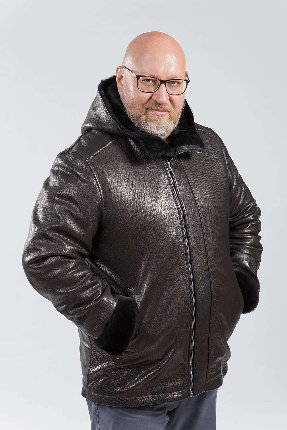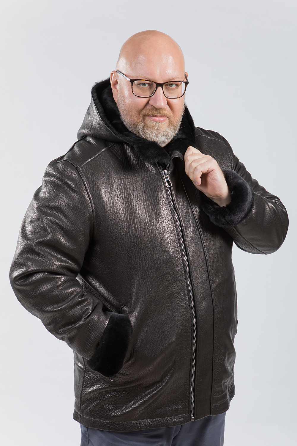 Куртка мужская из натуральной кожи с капюшоном. Внутри модели утеплитель из натуральной овчины. Изделие и карманы застегиваются на молнию. Рукава модели можно завернуть манжетами при необходимости. Длина изделия 78 см. Куртка прекрасно выдерживает перепады температур и держит тепло!