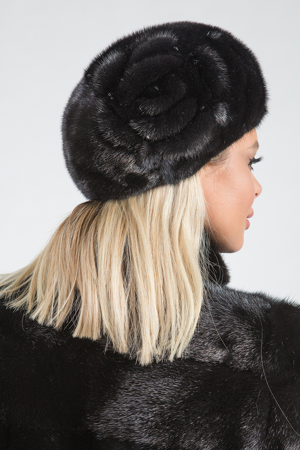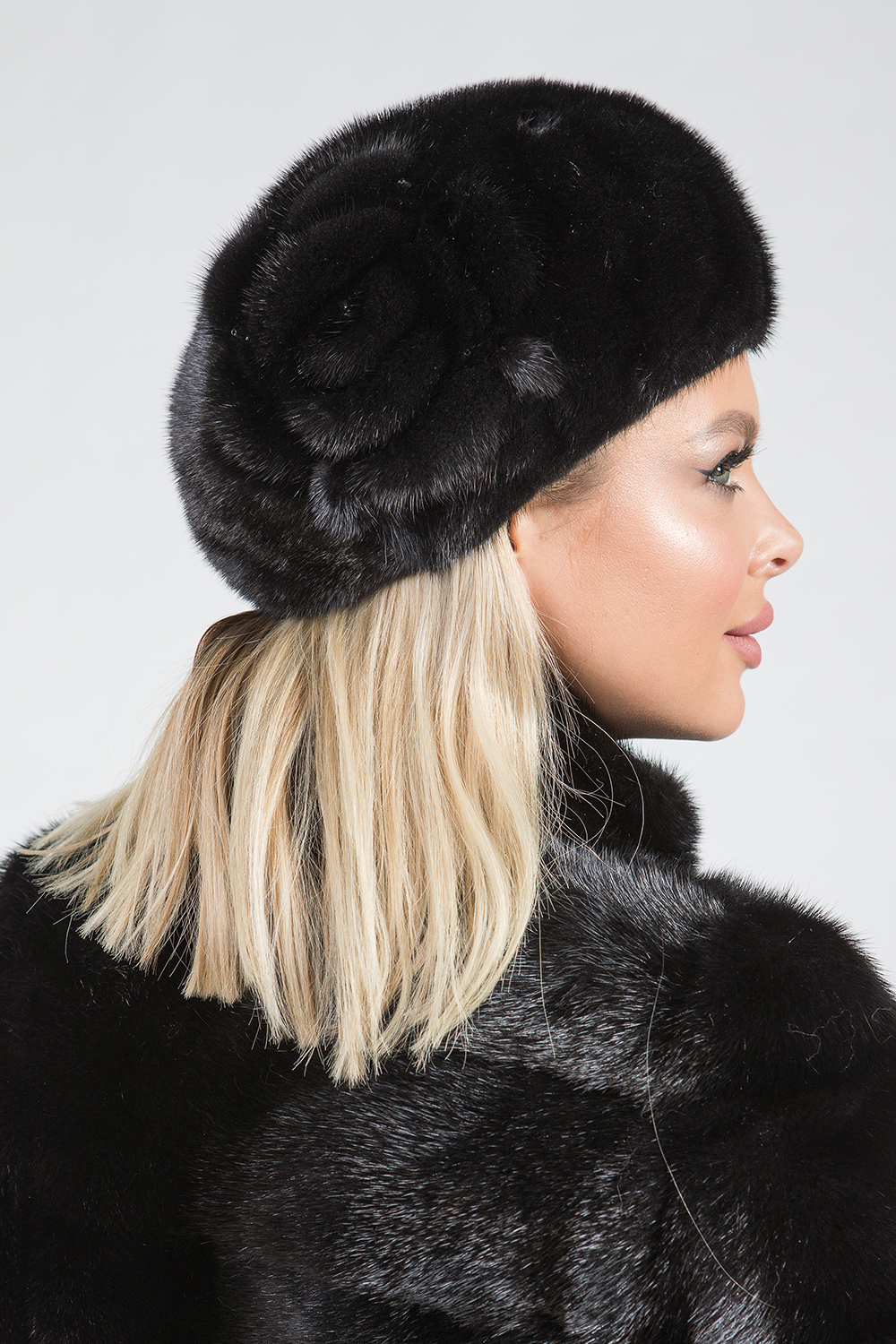 Берет женский из меха норки. Изделие внутри оснащено регулирующей утяжкой. Модель сбоку декорирована цветком из меха норки и бусинками. Берет теплый и мягкий, его легко можно свернуть и положить в женскую сумочку. Универсальная, классическая модель подойдет к любому меховому пальто!