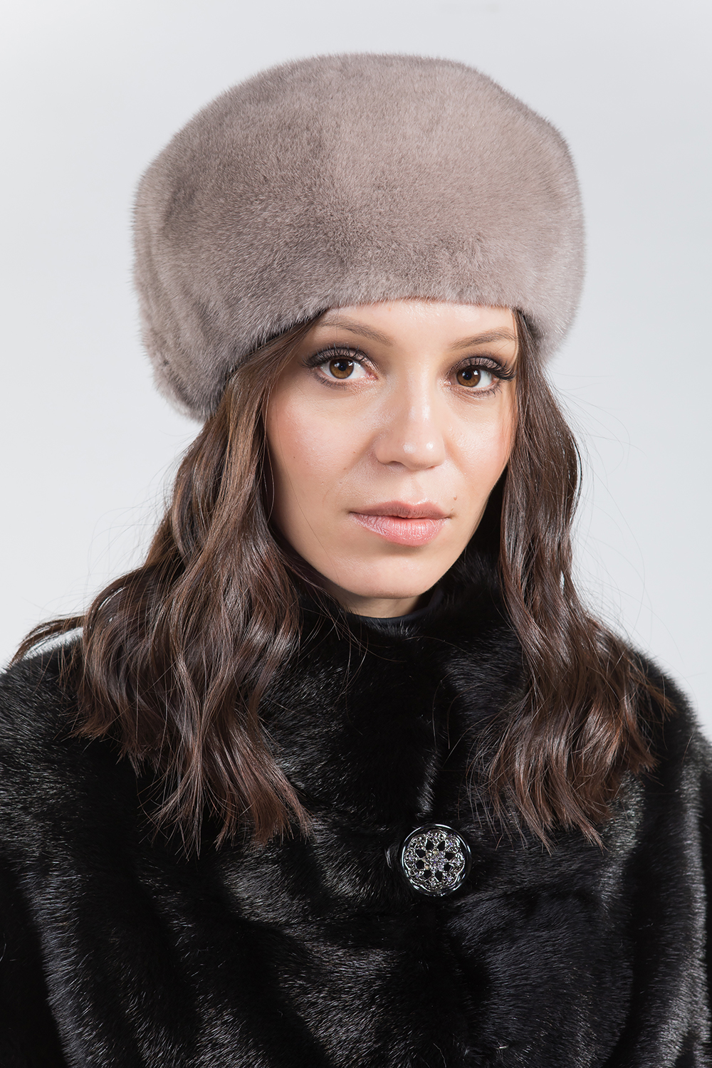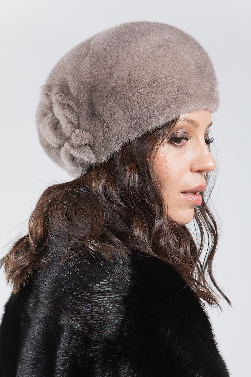 Берет женский из меха норки. Изделие внутри оснащено регулирующей утяжкой. Модель сбоку декорирована цветком из меха норки и оригинальной брошью. Берет теплый и мягкий, его легко можно свернуть и положить в женскую сумочку. Универсальная, классическая модель подойдет к любому меховому пальто!