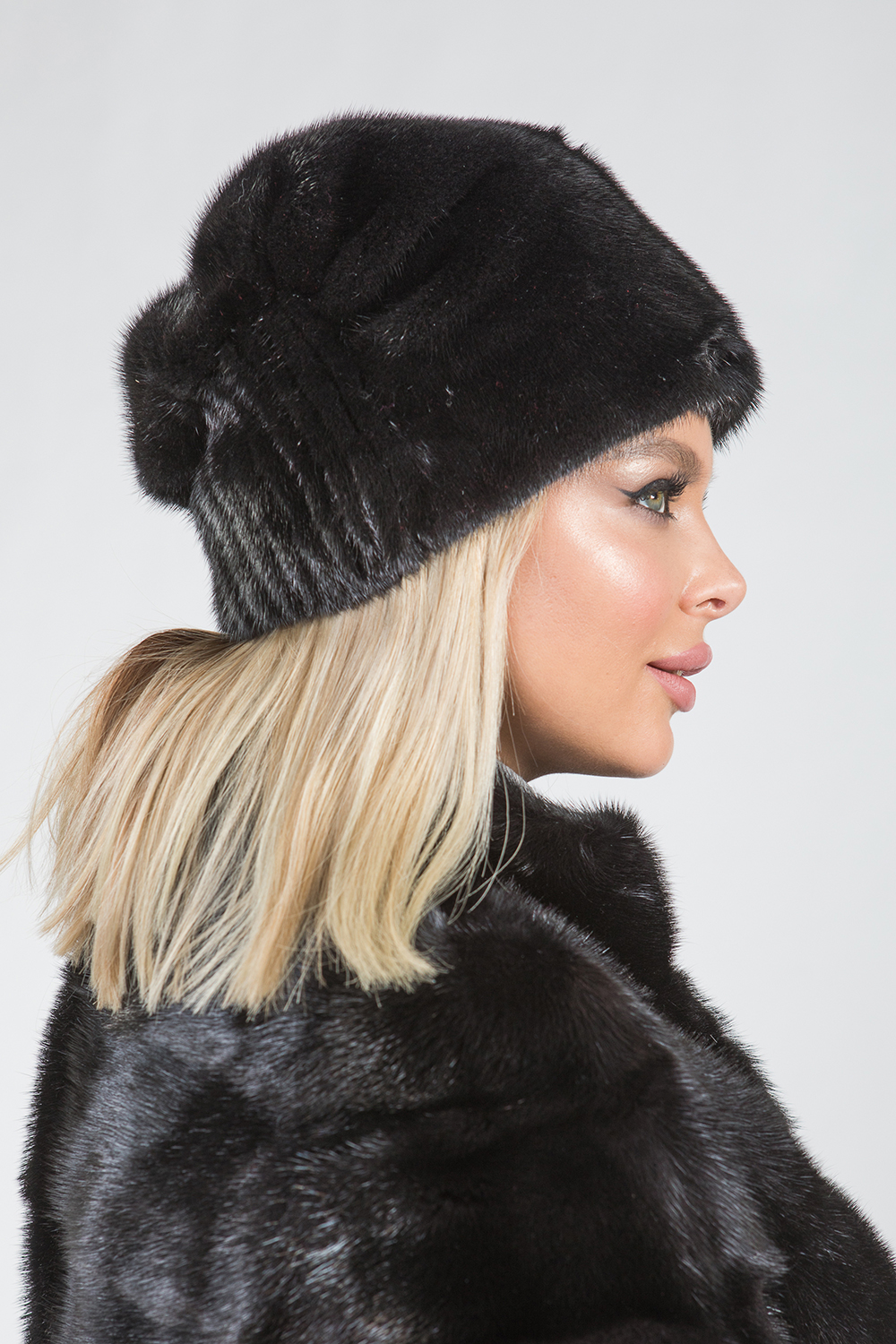Шапка женская из меха норки. Модель внутри оснащена трикотажной широкой резинкой. Вверху изделие декорировано брошью в виде лилии. Шапочка теплая и мягкая, ее легко можно свернуть и положить в женскую сумочку. Универсальная модель подойдет к любому меховому пальто!