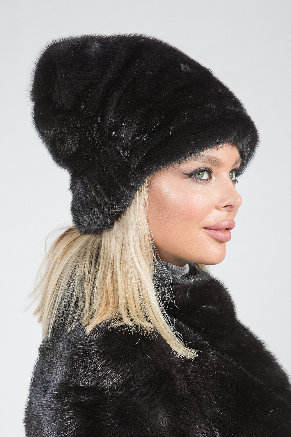 Шапка женская из меха норки. Модель внутри оснащена регулирующей утяжкой. Изделие декорировано черными бусинками вверху и по бокам шапочки. Модель универсальная и теплая, ее легко можно свернуть и положить в женскую сумочку. Она не займет много места и не потеряет форму. Шапочка подойдет к любому меховому пальто и будет согревать в морозную погоду!