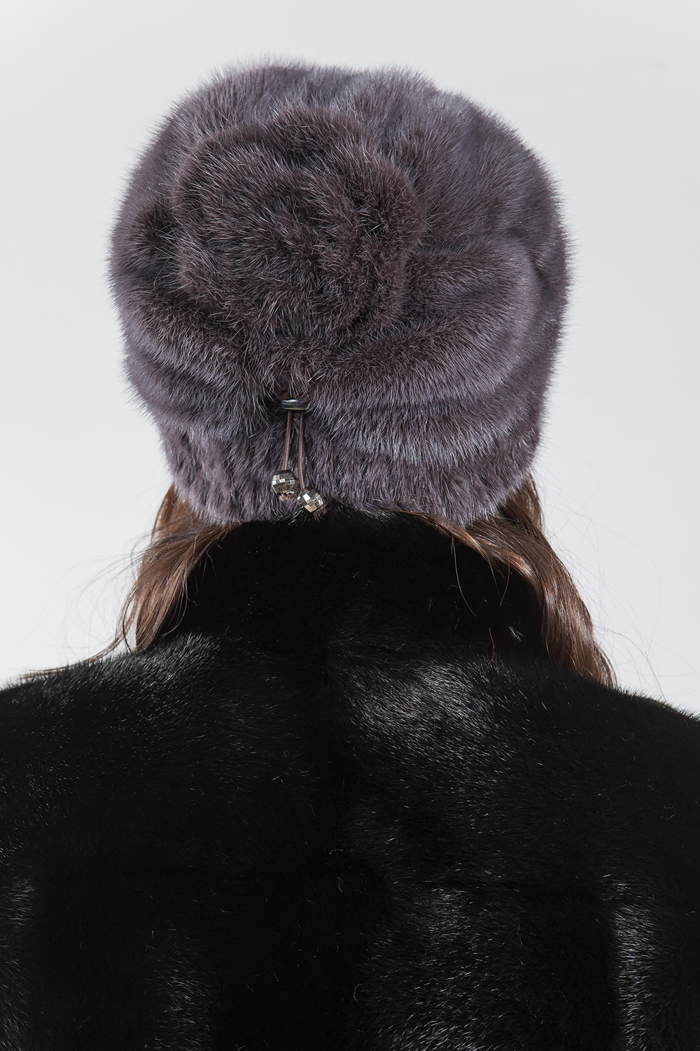 Шапка женская из меха норки. Модель внутри оснащена регулирующей резинкой, чтобы шапочка могла подойти на несколько размеров. Изделие декорировано сзади цветком из меха норки. Модель универсальная и теплая, ее легко можно свернуть и положить в женскую сумочку. Она не займет много места и не потеряет форму. Шапочка стильного цвета сливы подойдет к любому меховому пальто и будет согревать в морозную погоду!