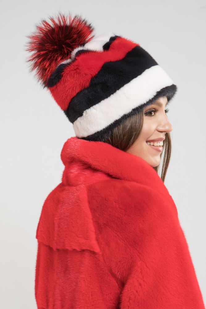 Шапка из меха норки. По низу модели регулирующая резинка. Теплая, красивая и универсальная шапочка, так как носить ее можно как со спортивной курткой, так и с шубкой классического силуэта.