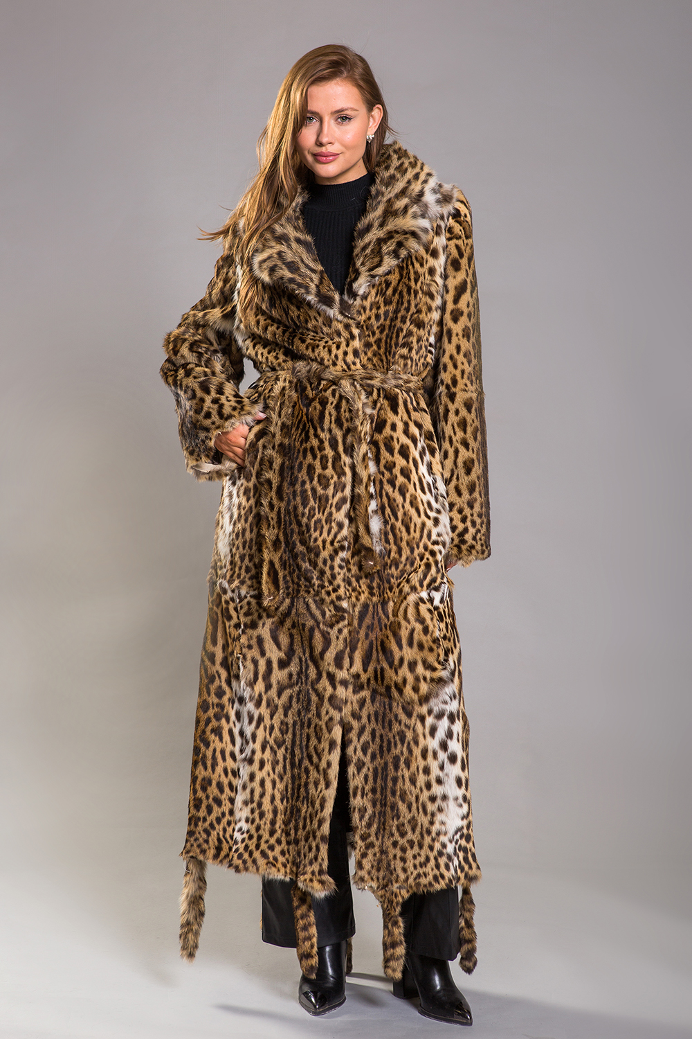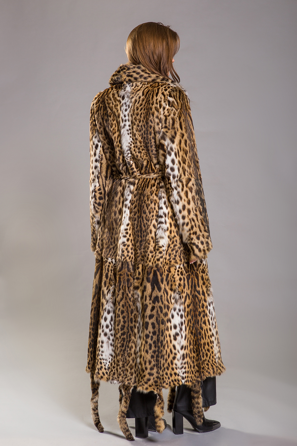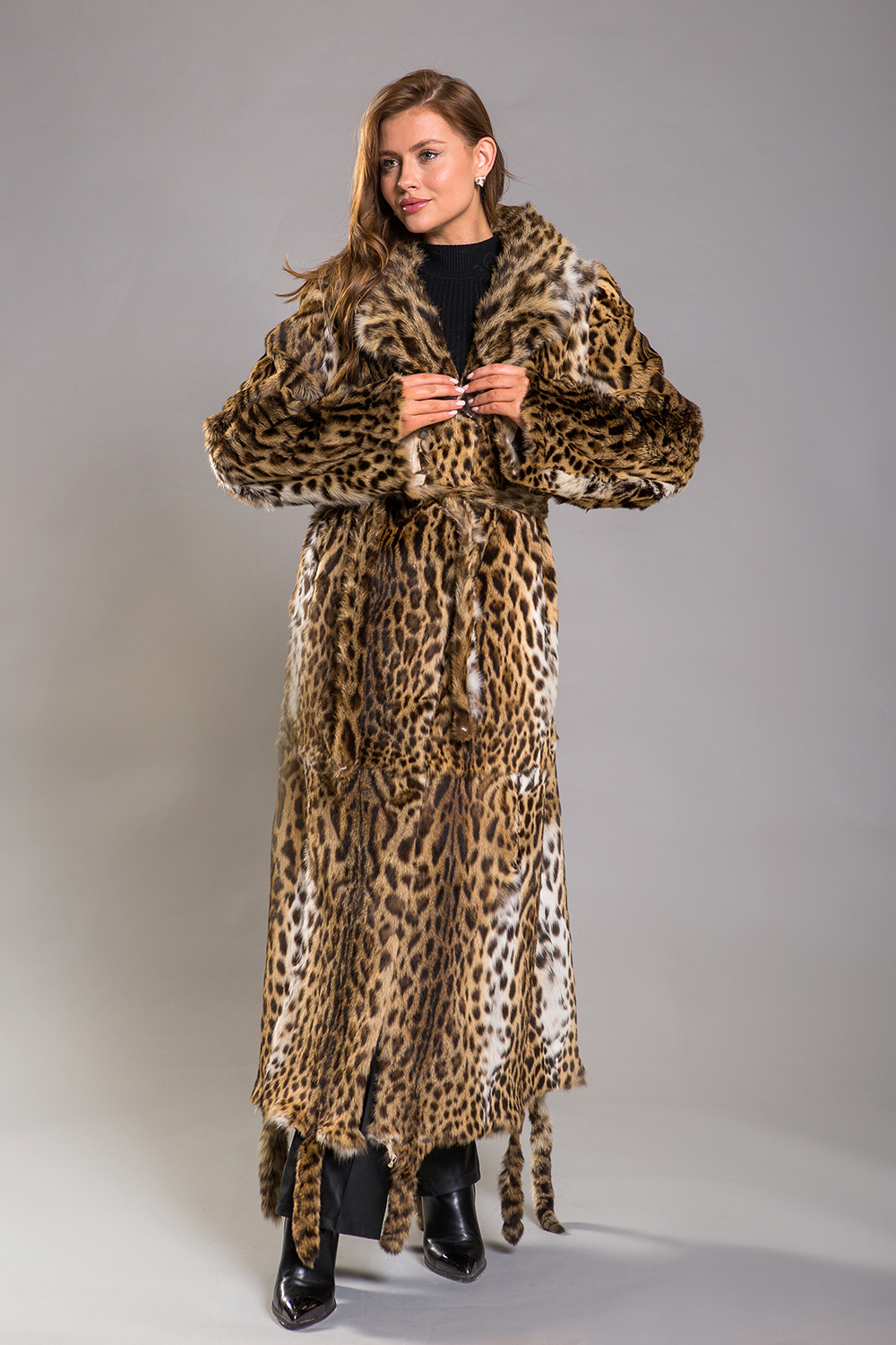 Длина модели составляет 130 см, а меховой пояс позволяет скорректировать шубку по фигуре. Эта модель из натурального меха оцелота не останется незамеченной окружающими!