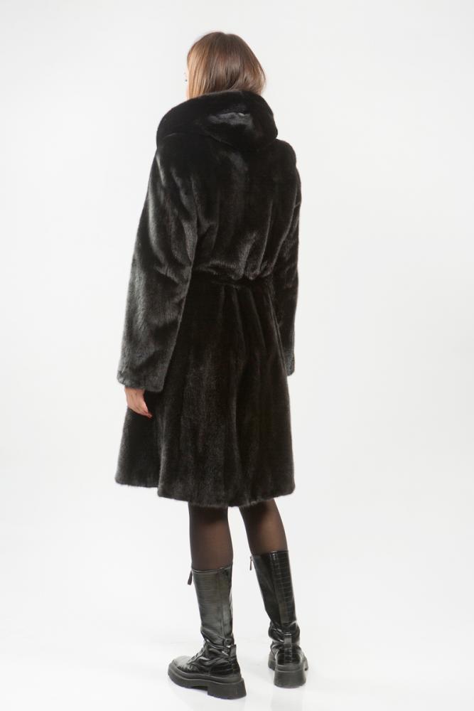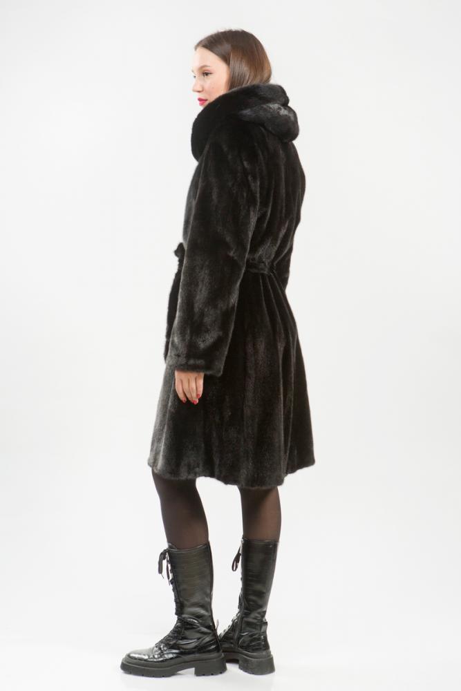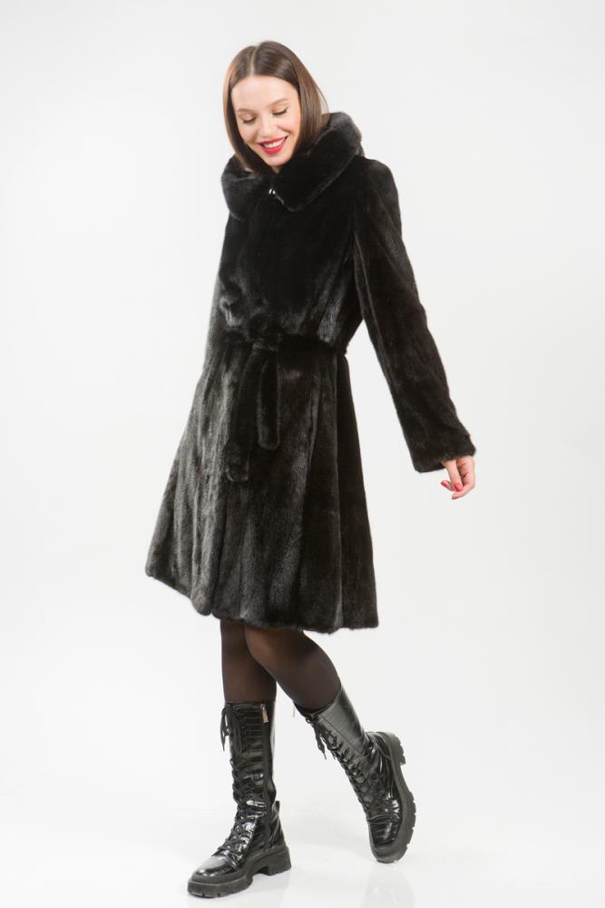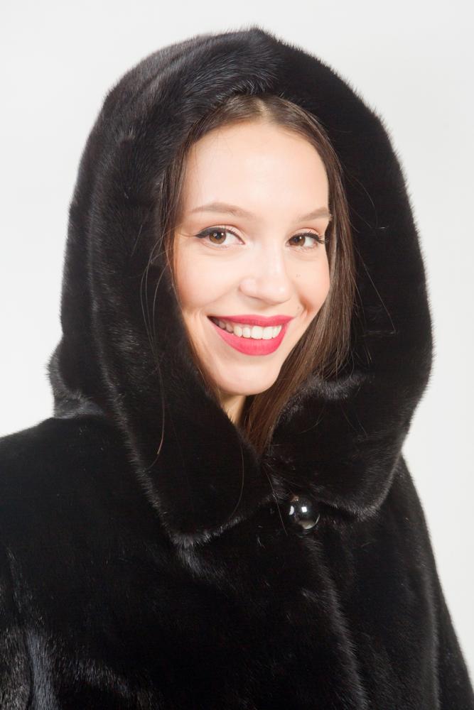 Полупальто из норкового меха с капюшоном. Модель выполнена по технике роспуска с добавлением пластин. Рукава оснащены регулируемыми утяжками. В комплекте пояс из норки. Длина изделия составляет 100 см. Это очаровательная молодежная модель. Низ изделия слегка расклешен, создавая эффект юбочки, а сзади образуются красивые фалды. Комфортное лекало обеспечивает удобство носки, а благородный черный цвет меха придает образу элегантность и презентабельность.