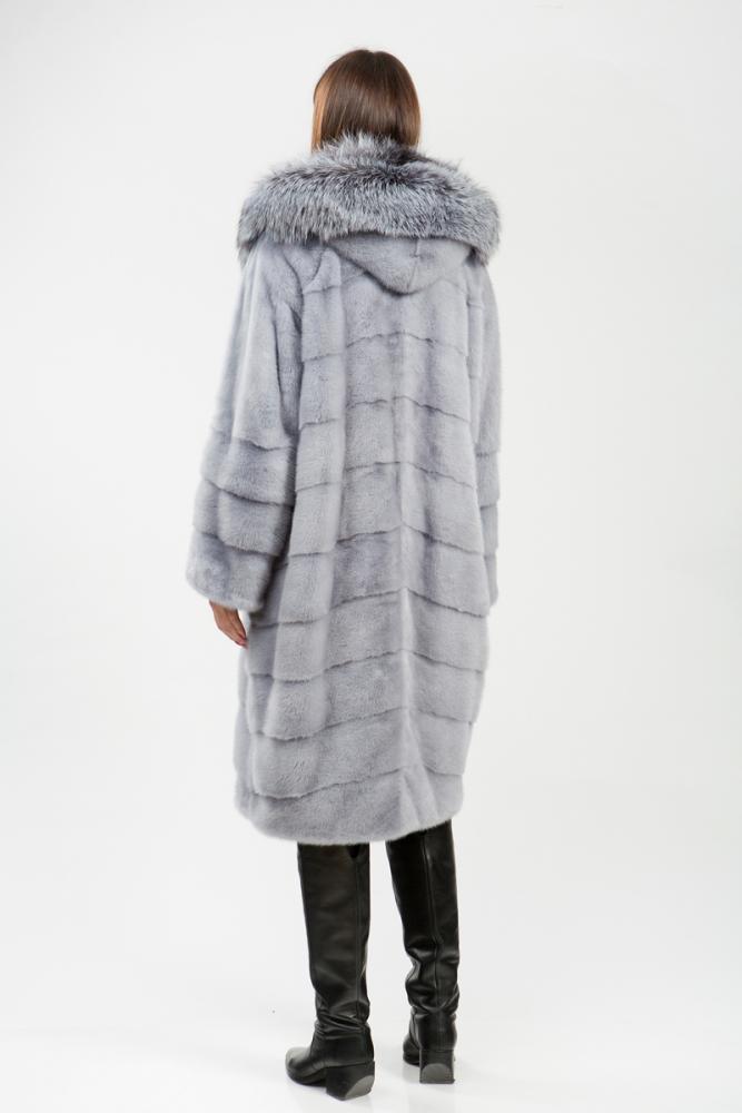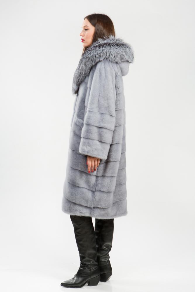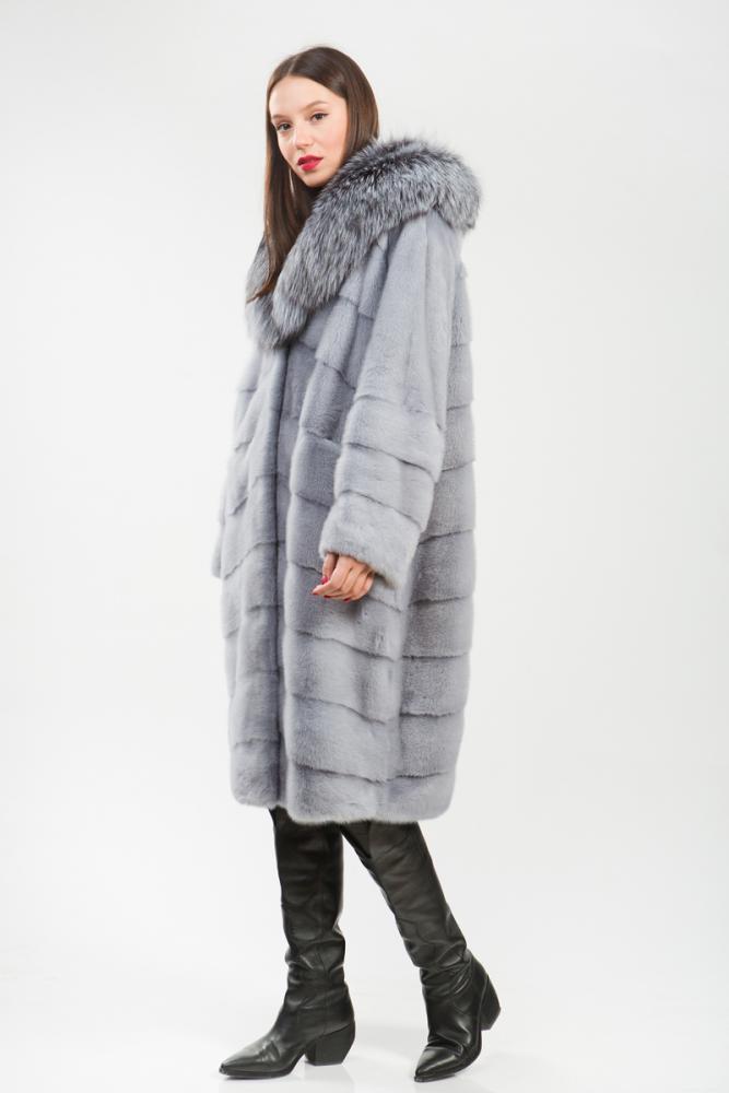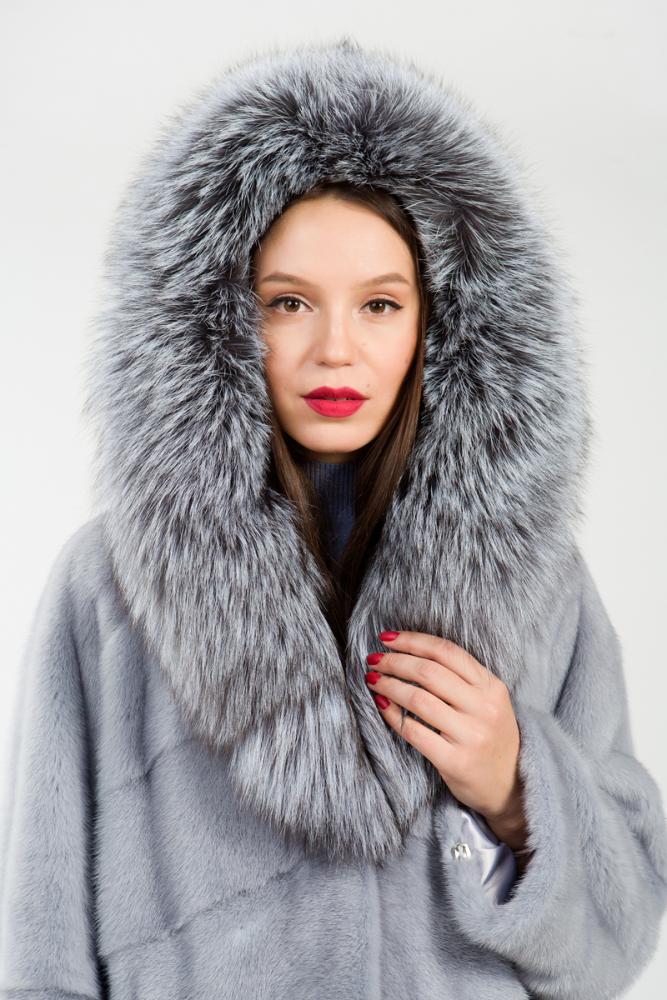 Полупальто из норкового меха с капюшоном, украшенным мехом чернобурой лисы, отличается диагональной выкладкой пластин. Внутренняя часть изделия оснащена регулируемыми утяжками на талии, рукавах и по низу. Длина полупальто составляет 110 см, а рукава можно трансформировать для укороченного вида. Эта норковая шубка с эффектным лисьим капюшоном подчеркивает безупречный вкус своей обладательницы, а светлый оттенок муссона освежает и омолаживает образ.