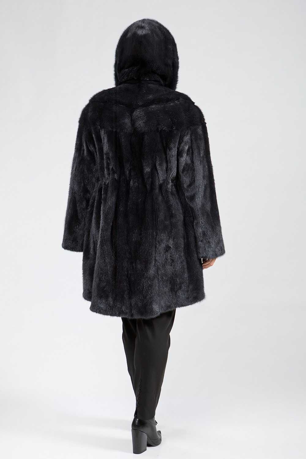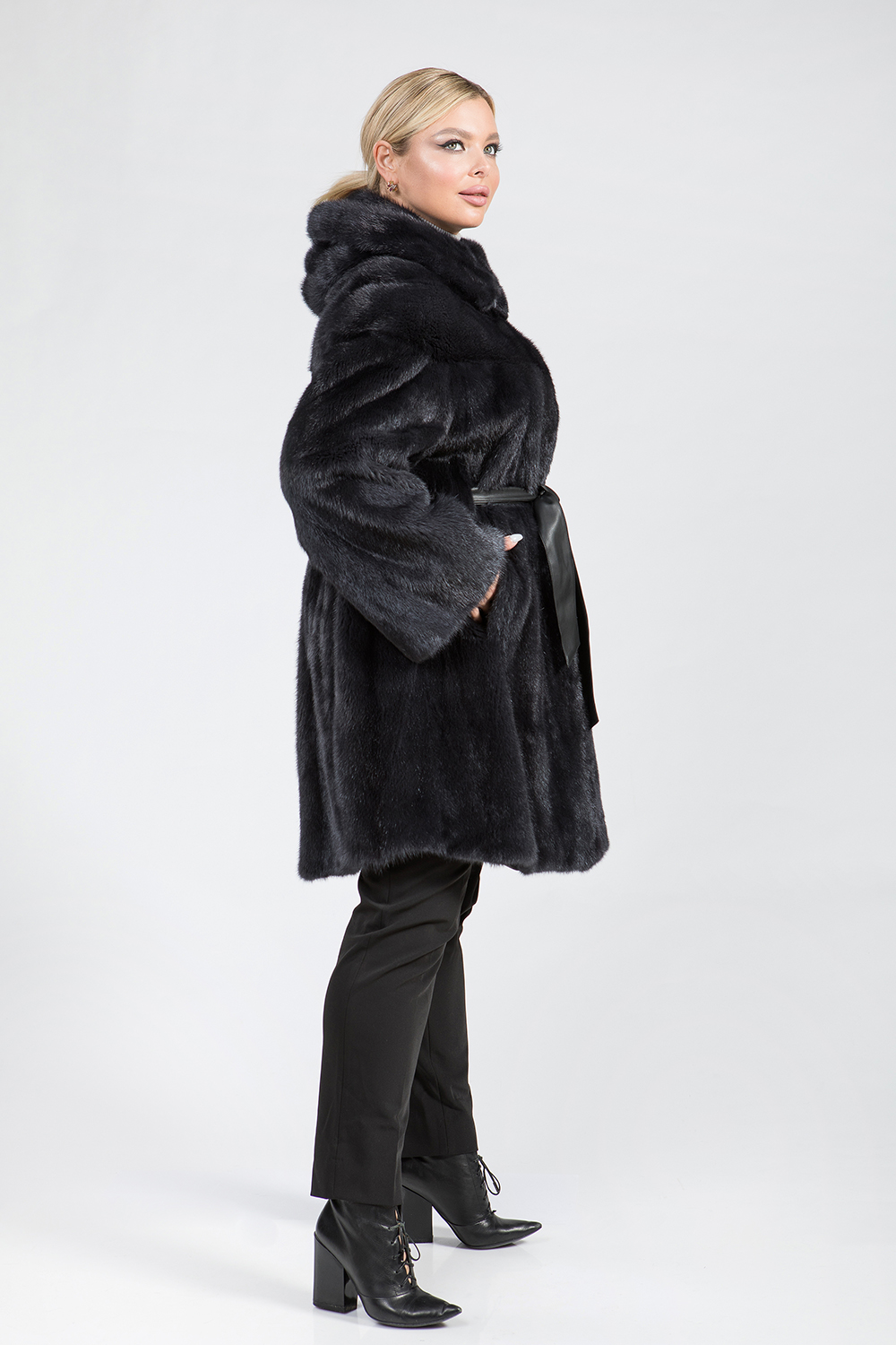 Полупальто из норкового меха с капюшоном, выполненное в стиле роспуск с добавлением пластин, обеспечивает комфорт благодаря регулируемой утяжке на рукавах. Изящный кожаный пояс, проходящий внутри изделия, подчеркивает линию талии, придавая образу утонченность. Длина полупальто составляет 100 см. Элегантная модель в цвете муссона отличается оригинальностью и очарованием, покоряя своим внешним видом.