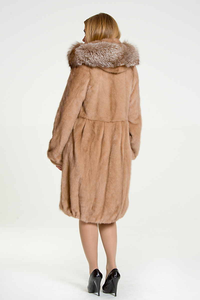 Полупальто из меха норки, украшенное капюшоном с отделкой из меха лисы. Модель выполнена в технике роспуск с использованием пластин. На талии есть регулирующая утяжка, позволяющая создавать идеальный силуэт. Низ изделия слегка присобран, создавая впечатление цветка тюльпана. Длина полупальто составляет 100 см.
