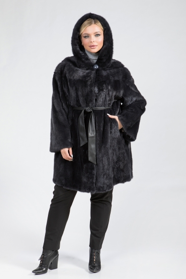 Полупальто из норкового меха с капюшоном. Модель выполнена в технике роспуска с добавлением пластин. На рукавах предусмотрена регулируемая утяжка. Внутри изделия расположен кожаный пояс, который изящно подчеркивает талию и добавляет шарма образу. Длина полупальто составляет 100 см. Эта стильная шубка в муссоновом оттенке привлекает внимание своей оригинальностью и изяществом!