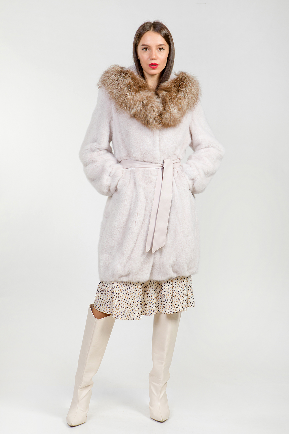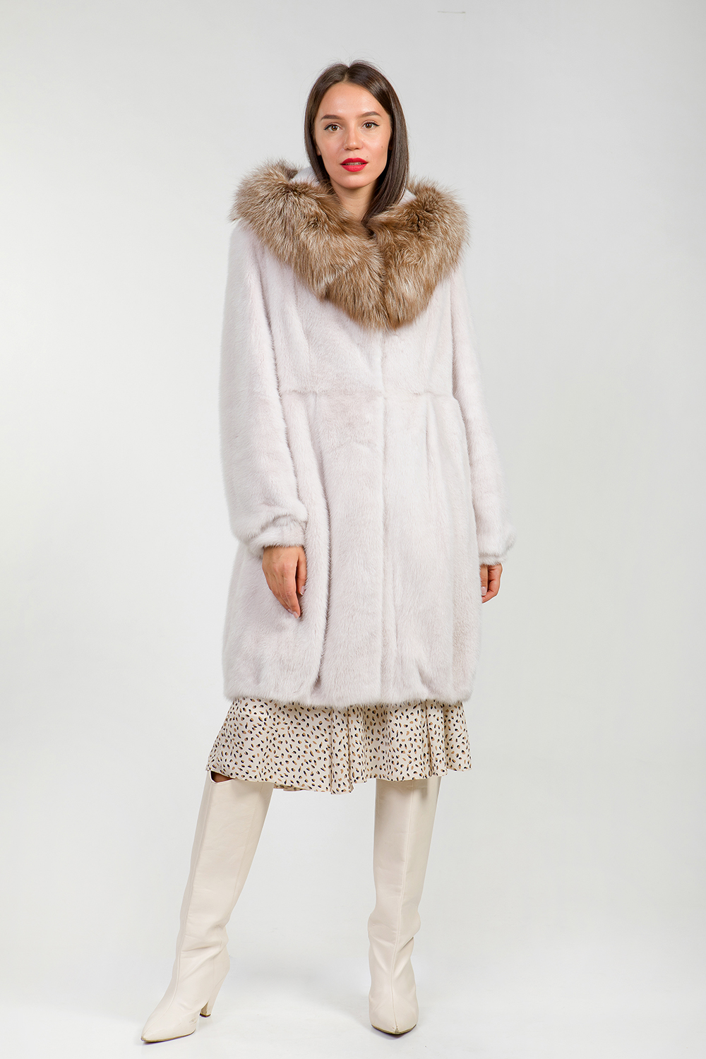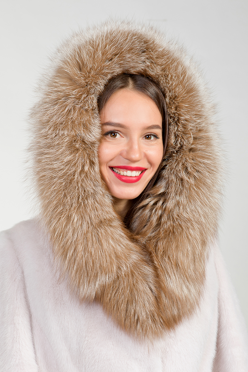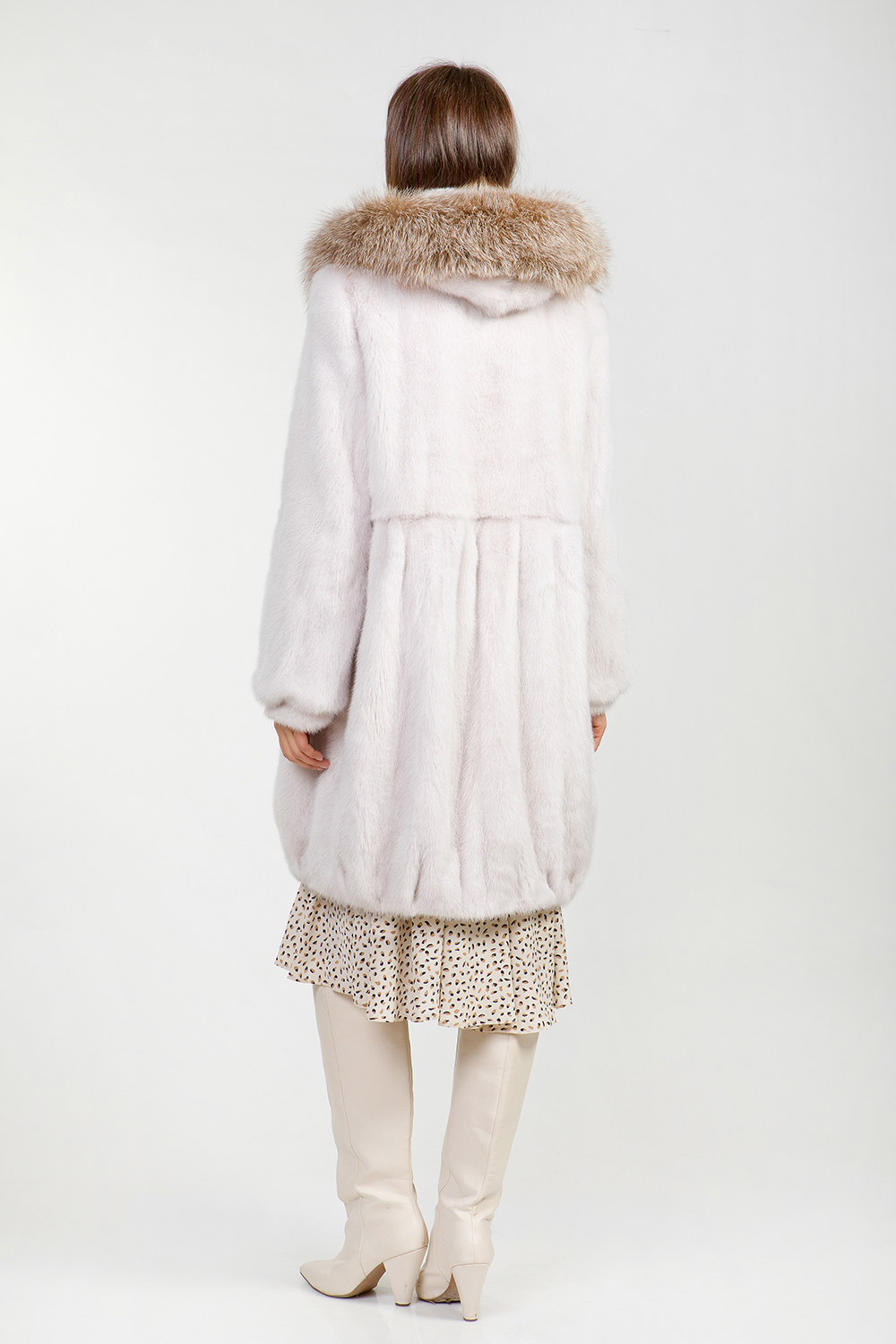 Полупальто из меха норки с капюшоном, украшенным лисьим мехом. Модель выполнена в технике роспуска с добавлением пластин. На талии имеется регулируемая утяжка. Низ изделия слегка присборен и напоминает цветок тюльпана. Длина полупальто составляет 100 см. Лекало обеспечивает максимальный комфорт, а благородные оттенки циркона придают образу безупречную гармонию!
