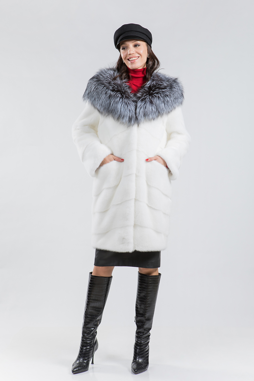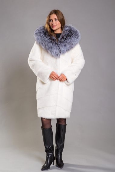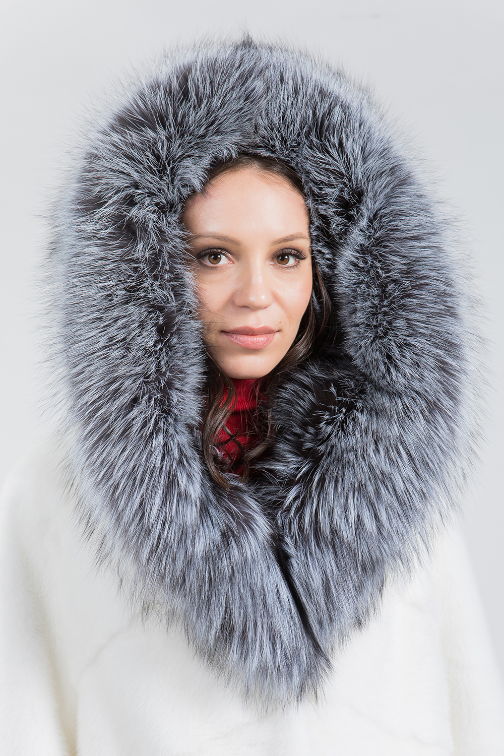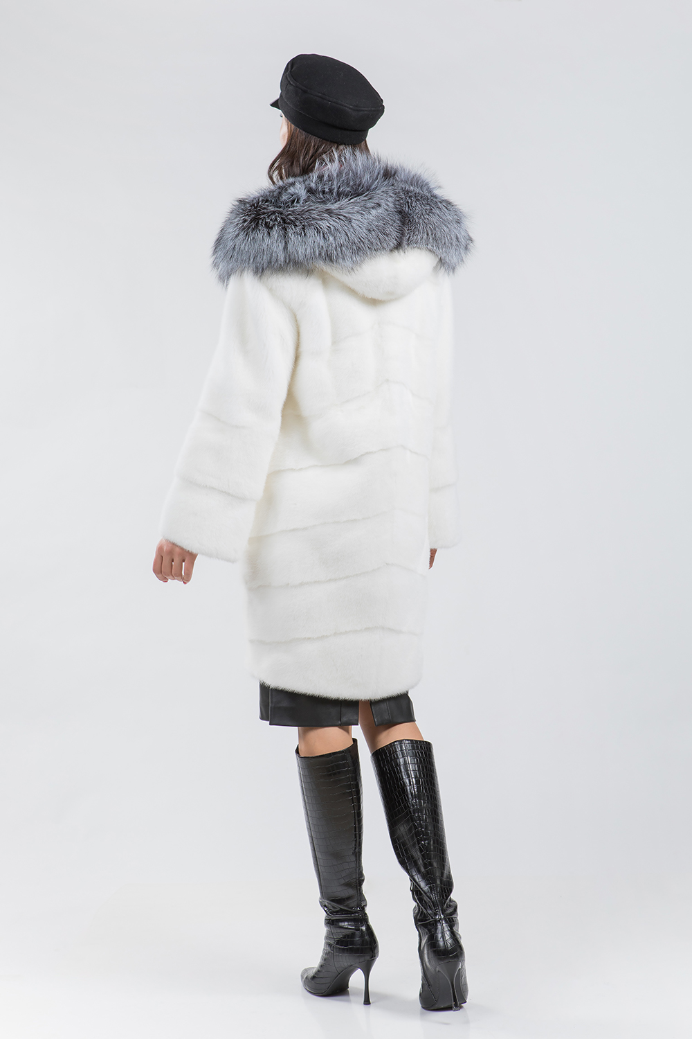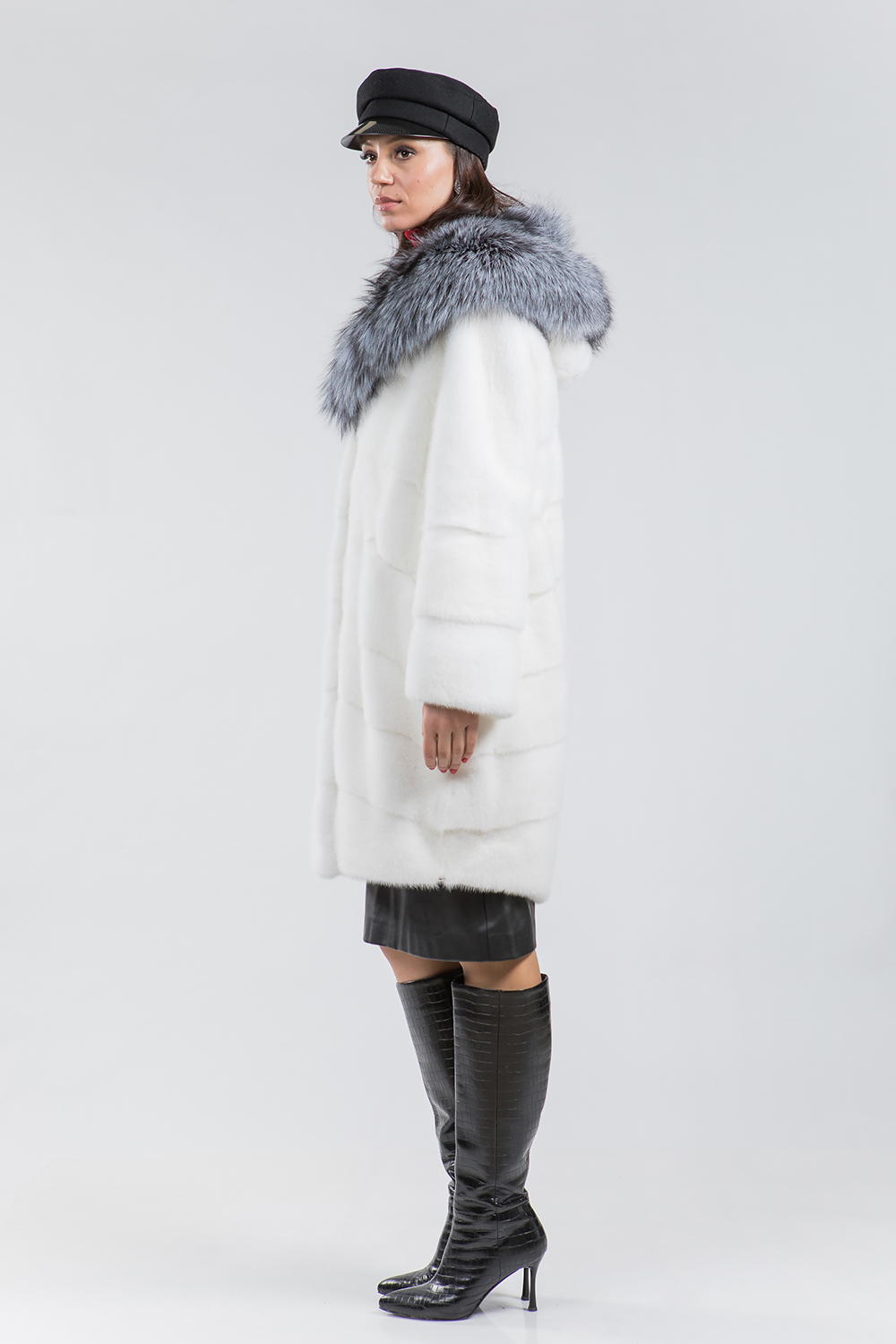 Полупальто из меха норки — это роскошный вариант для холодной погоды. Капюшон модели украшен великолепным мехом лисы, что придаёт ему ещё большую привлекательность.
