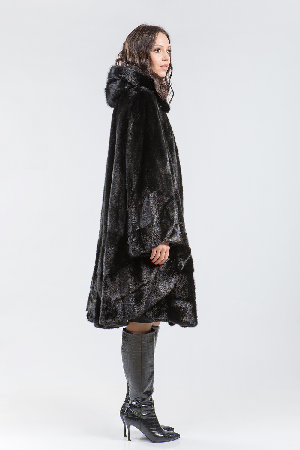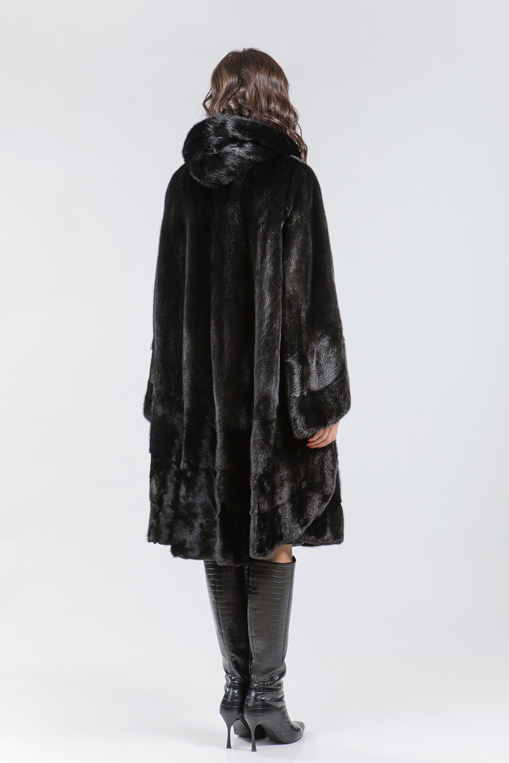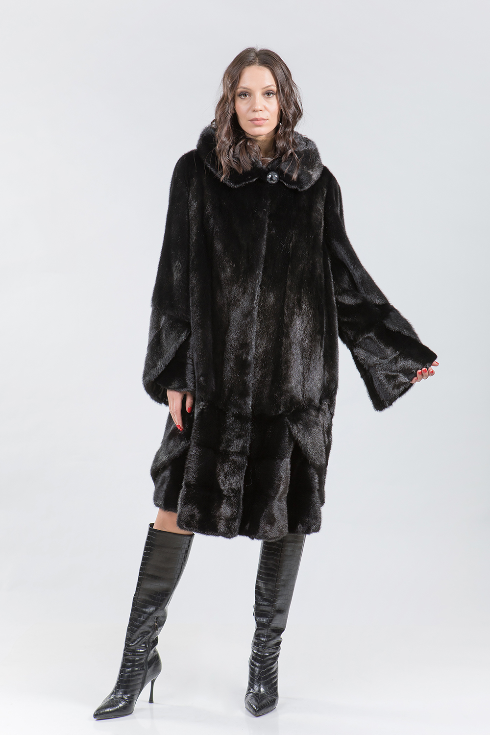 Полупальто из норки с капюшоном — это изделие, созданное по уникальной технологии роспуска меха с добавлением пластин. Длина модели составляет 110 см, что обеспечивает комфортную посадку и свободу движений.
