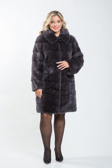 Полупальто из норки с капюшоном, выполненное в технике диагональной выкладки пластин, станет настоящим украшением вашего гардероба. Длина изделия составляет 100 см.