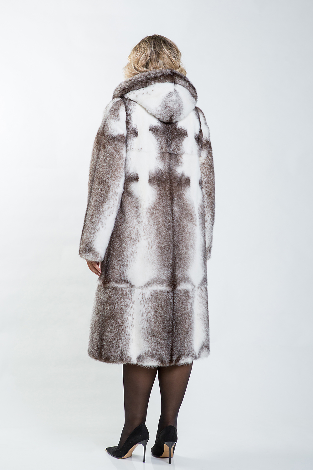 Полупальто из норки с капюшоном, выполненное из пластин с добавлением роспуска. Модель оснащена регулируемыми утяжками на рукавах и в области талии, что позволяет создать идеальный силуэт. Длина изделия составляет 110 см.
