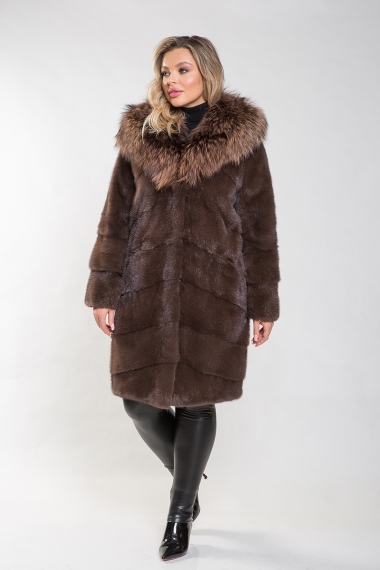 Полупальто из норки с капюшоном из рыси выполнено в технике диагональной выкладки пластин, что придает ему изысканность. Для удобства предусмотрены регулируемые утяжки на талии, рукавах и по низу изделия. Длина изделия 110 см, рукава модели можно укоротить при помощи скрытых молний. Карманы фиксируются на магнитах.