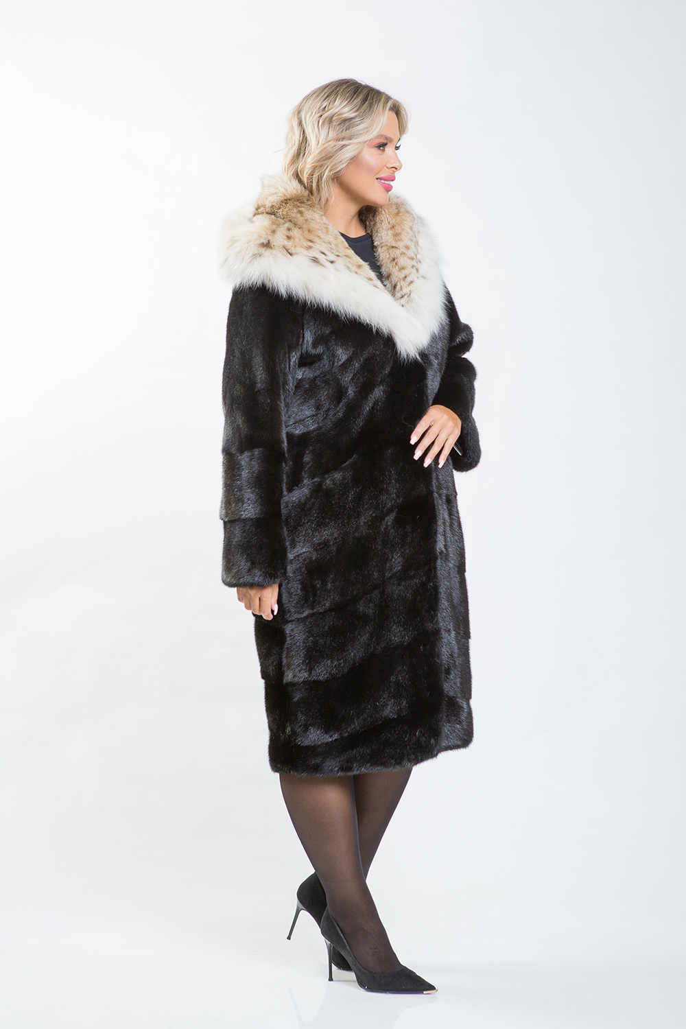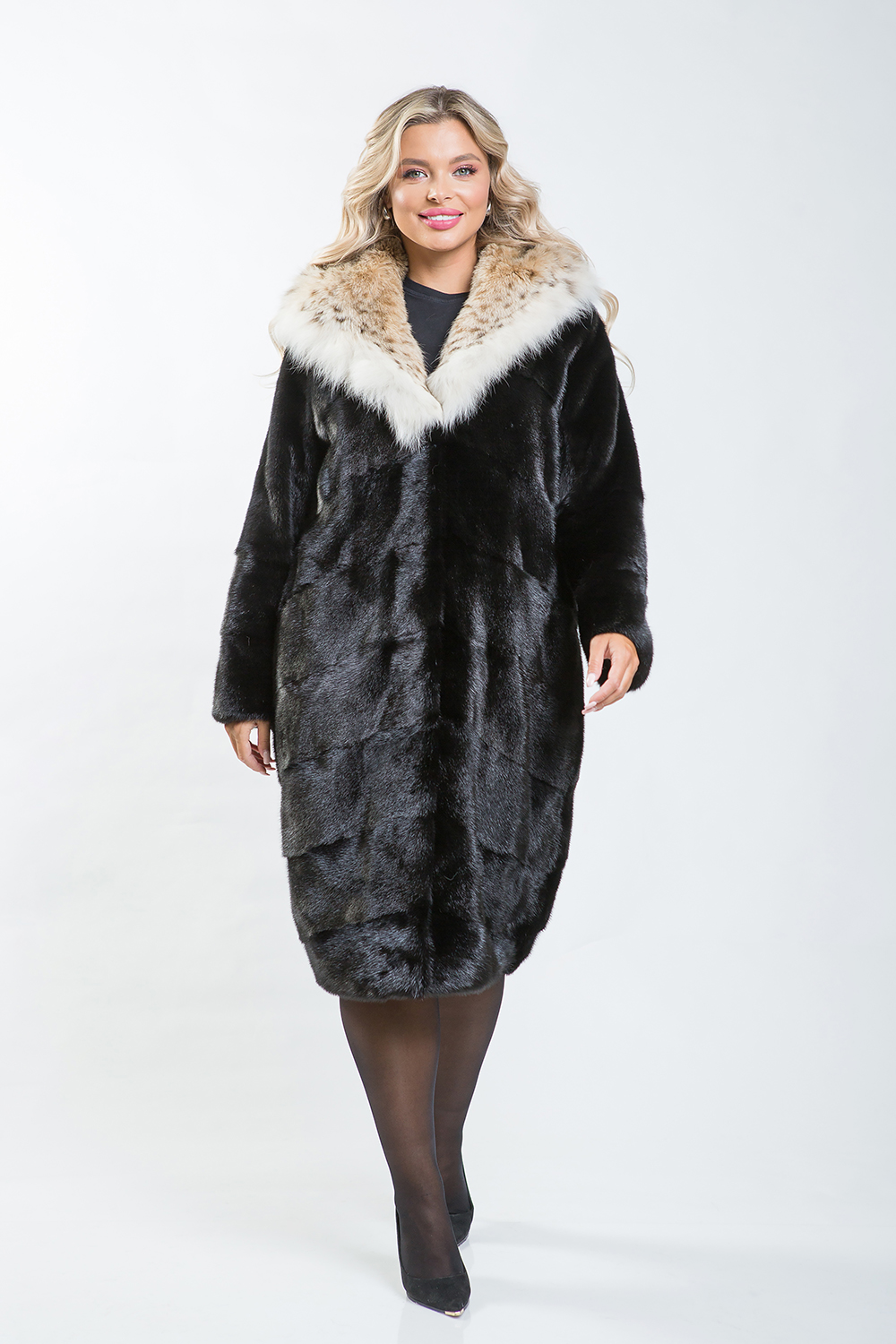 Благодаря удобному крою это меховое пальто обеспечивает максимальный комфорт, а капюшон из великолепного меха рыси придаёт образу изысканность и величие. Такая модель идеально подходит для солидных женщин и подчёркивает их статус успешной личности.