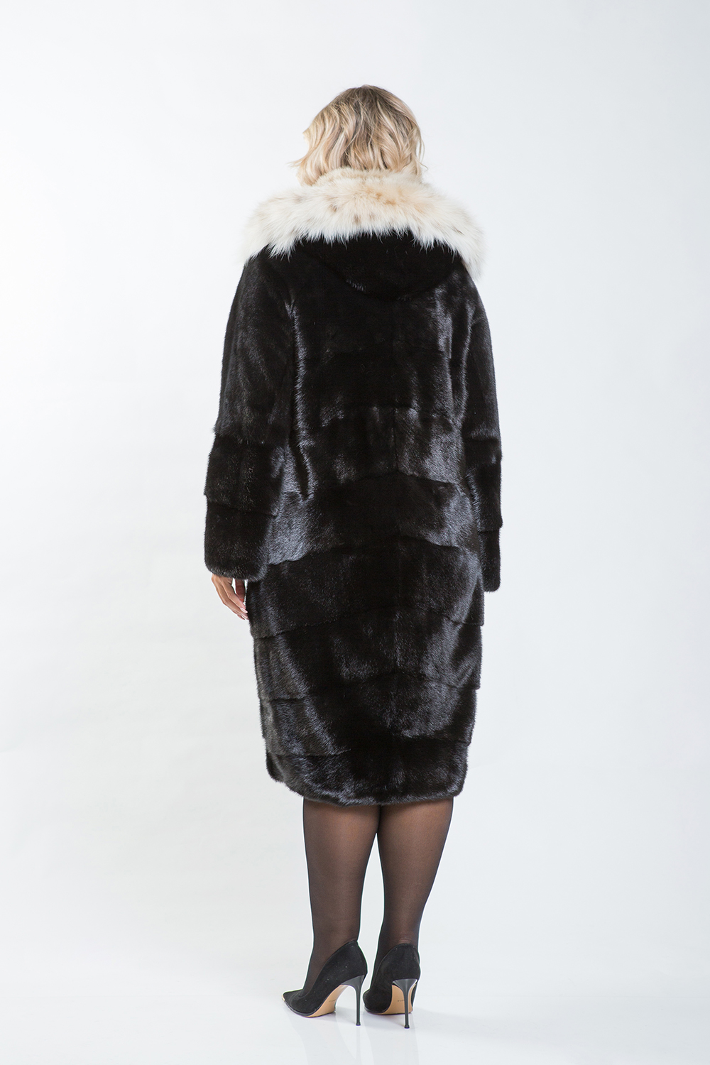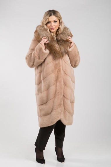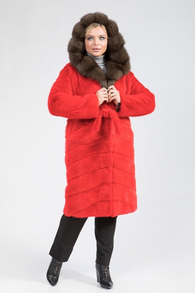 Полупальто из меха норки, украшенное капюшоном из меха рыси. Модель выполнена в технике диагональной выкладки пластин, что придаёт ей особый шик. Для удобства предусмотрены регулирующие утяжки на талии, рукавах и внизу изделия. Длина полупальто составляет 110 см, а его рукава могут трансформироваться в более укороченные. Карманы фиксируются магнитами.