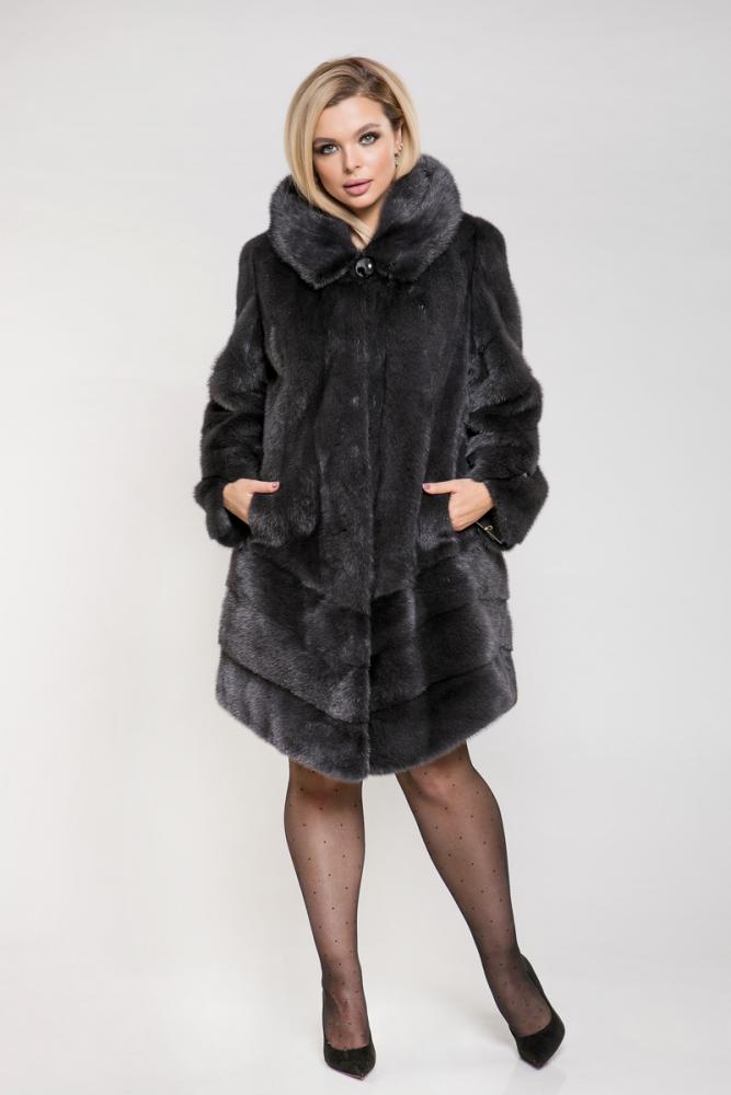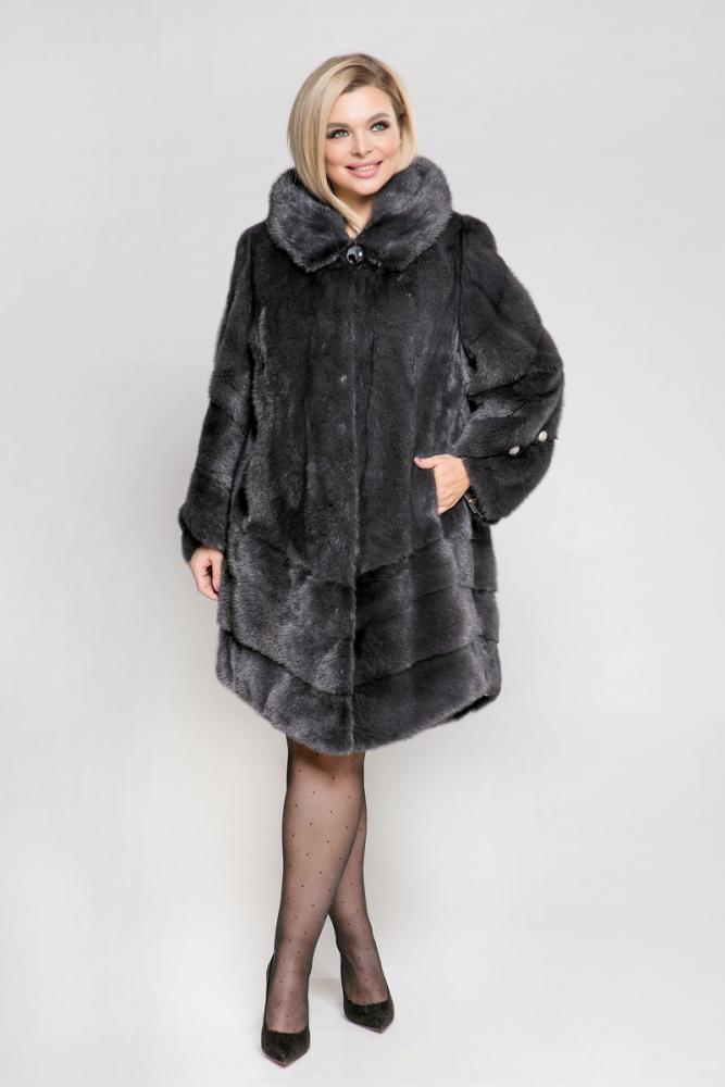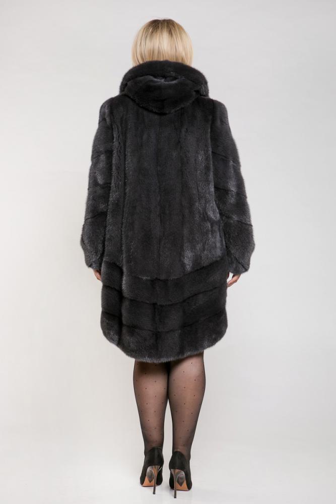 Полупальто из норкового меха с капюшоном. Крой модели — роспуск. Рукава и низ изделия выполнены с использованием диагональной выкладки пластин. Внутри на талии шубка оснащена регулирующей утяжкой, что позволяет подстроить изделие под свой вкус.