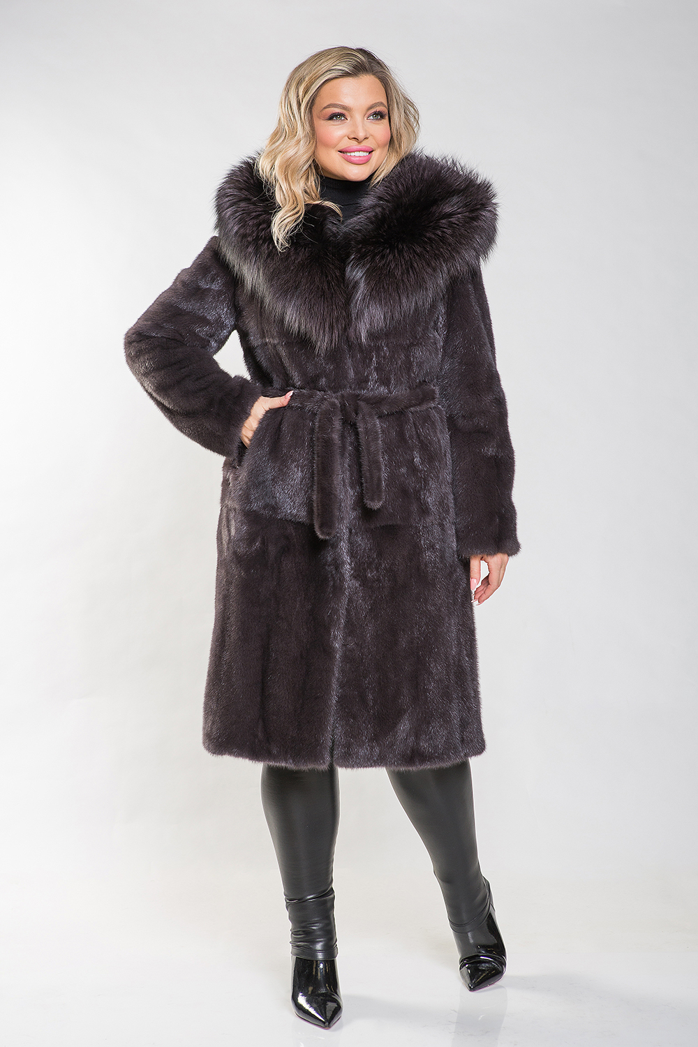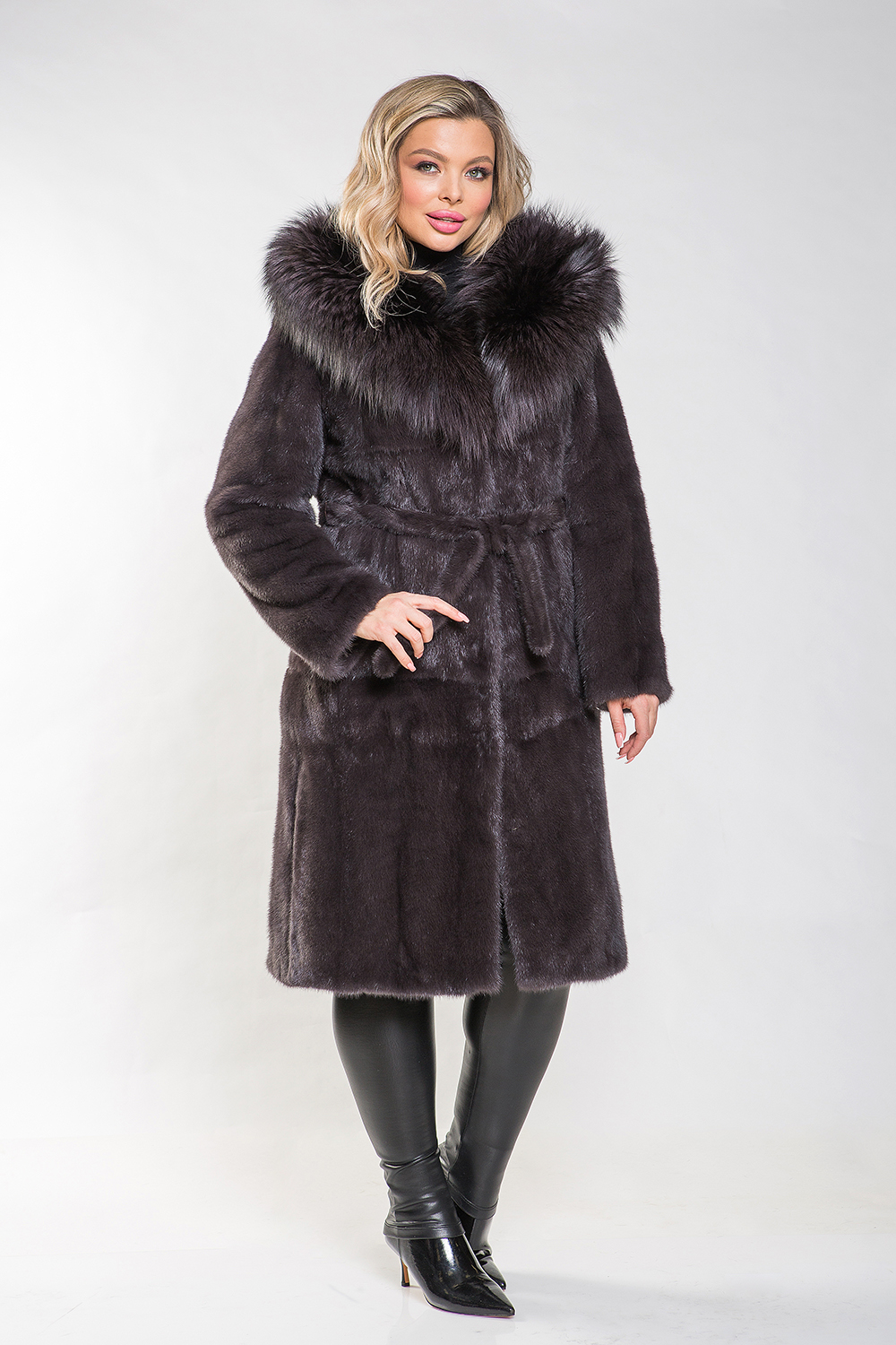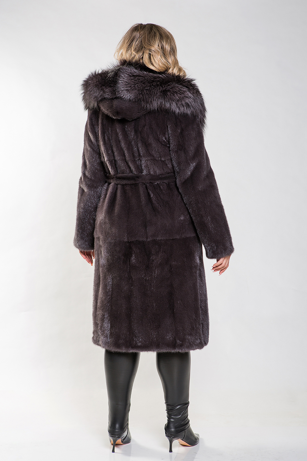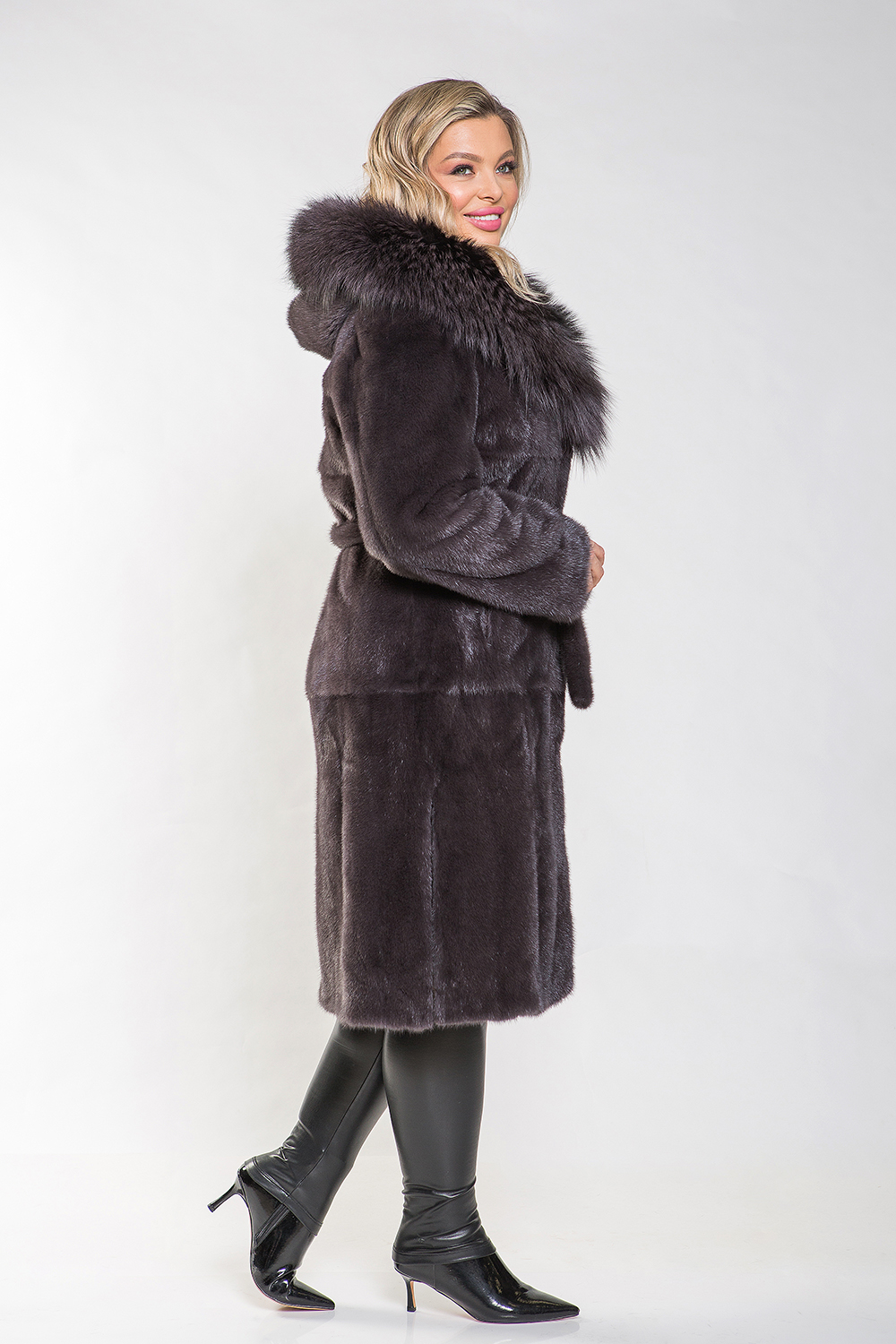 Длина полупальто составляет 110 см, а меховой пояс подчеркивает стройность и элегантность силуэта. Эта шубка идеально подходит для создания строгого классического образа. Её изюминкой являются разрезы по бокам, которые придают образу особый шарм.