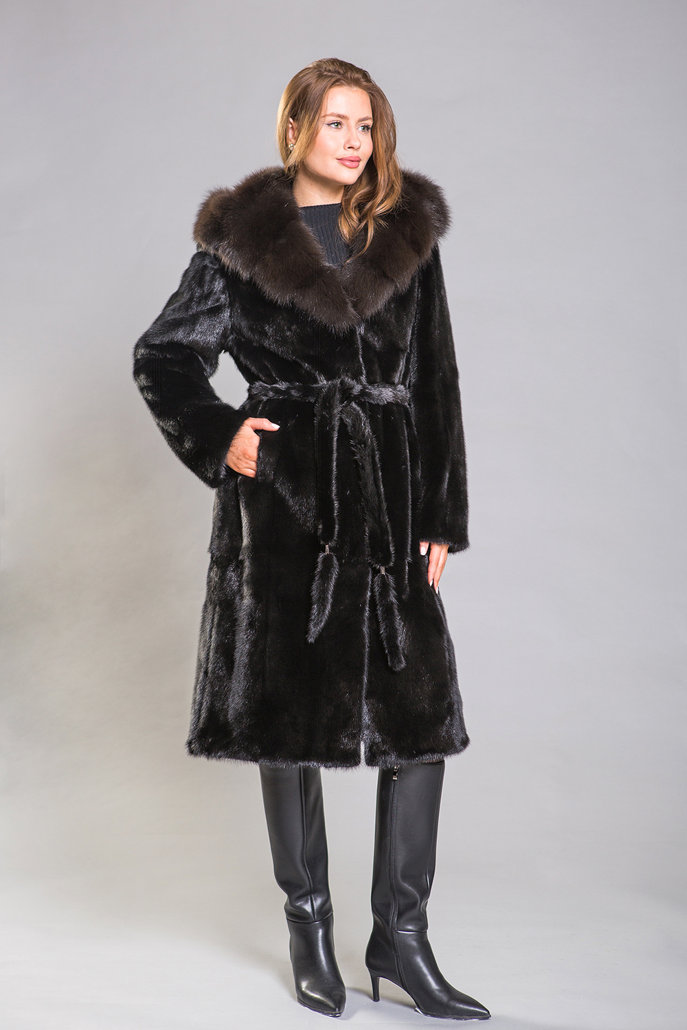 Длина полупальто составляет 110 сантиметров. Меховой пояс подчеркивает стройность и элегантность силуэта, делая образ более утонченным. Эта шубка прекрасно впишется в строгий классический стиль, а её изюминкой являются разрезы по бокам, которые добавляют особый шарм.
